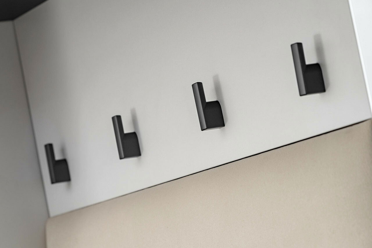 Vytvořte si dobře organizovaný a stylový vstupní prostor s předsíní Hagon v moderním provedení kašmír s černými detaily, moderní vzhled podtrhuje dekorativní potisk pruhů, který spojuje funkčnost s vizuální elegancí. Objevte předsíňové skříňky, které nabízejí více než jen první dojem. Díky promyšlenému vnitřnímu uspořádání získáte bohatý úložný prostor na boty, doplňky, tašky nebo sezónní oblečení. Zásuvka a skříňky s dvířky vám umožní udržovat pořádek a mít vše po ruce, ale zároveň elegantně skryté před zraky návštěv. Ideální řešení pro ty, kteří chtějí, aby jejich předsíň působila upraveně a stylově. Dalším prvkem předsíně je věšákový panel s horní policí a 4 samostatnými věšáky, které poskytují praktický prostor pro každodenní použití. Celkový vzhled předsíně doplňují čalouněné panely, které přinášejí nejen vizuální zjemnění, ale také pohodlí při obouvání. Efektivní součástí předsíně je panel se zrcadlem a horní policí. Poznámka: předsíň neobsahuje podsedák.