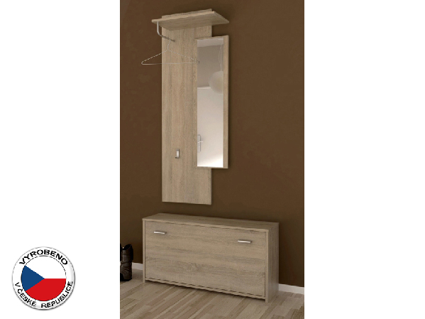 Jednoduchá předsíň v provedení dub sonoma sestávající z nízkého botníku a věšáku s úzkým zrcadlem. Na věšáku je umístěna šedá kovová věšáková tyč umístěna kolmo na věšák.