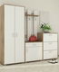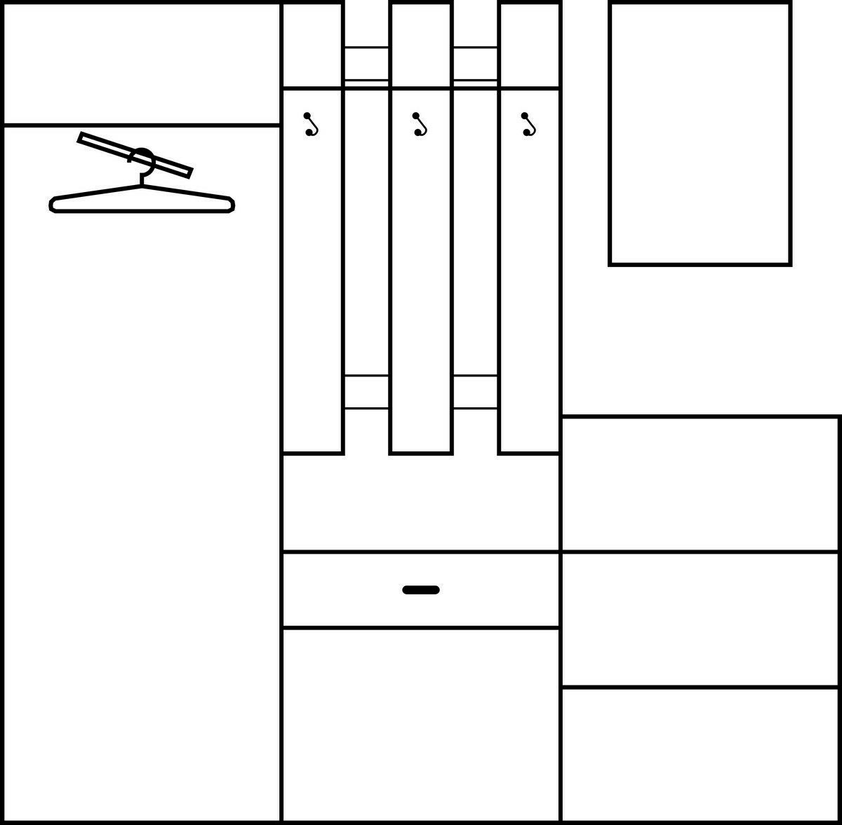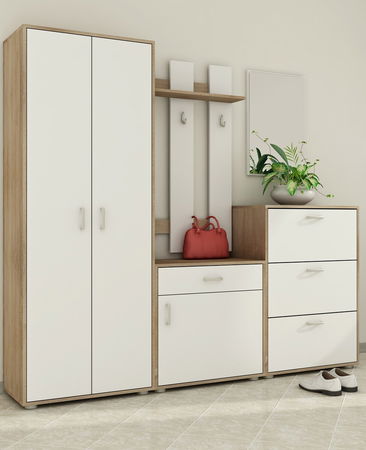 ZobrazitElegantní předsíň s dostatkem úložného prostoru. Skládá se z věšákové skříně, která je uvnitř vybavena věšákovou tyčí. Vedle skříně je věšákový panel se třemi hráčikmi, horní poličkou a komodou ze skříňkou s jednou zásuvkou na spodku. Vedle věšáku se umisťuje botník, který se skládá ze tří zásuvek. Nad botníkem se na stěnu upevňuje zrcadlo. Provedení korpusu je dub sonoma světlá a dvířka a zásuvky (fronty) jsou v bílé barvě. Drobné úzké úchyty jsou v šedé barvě.