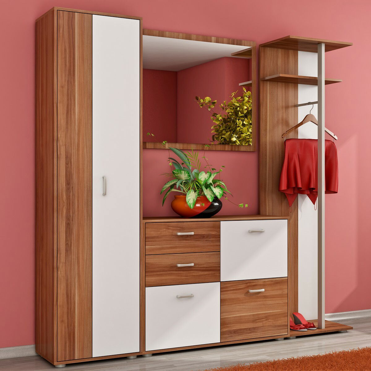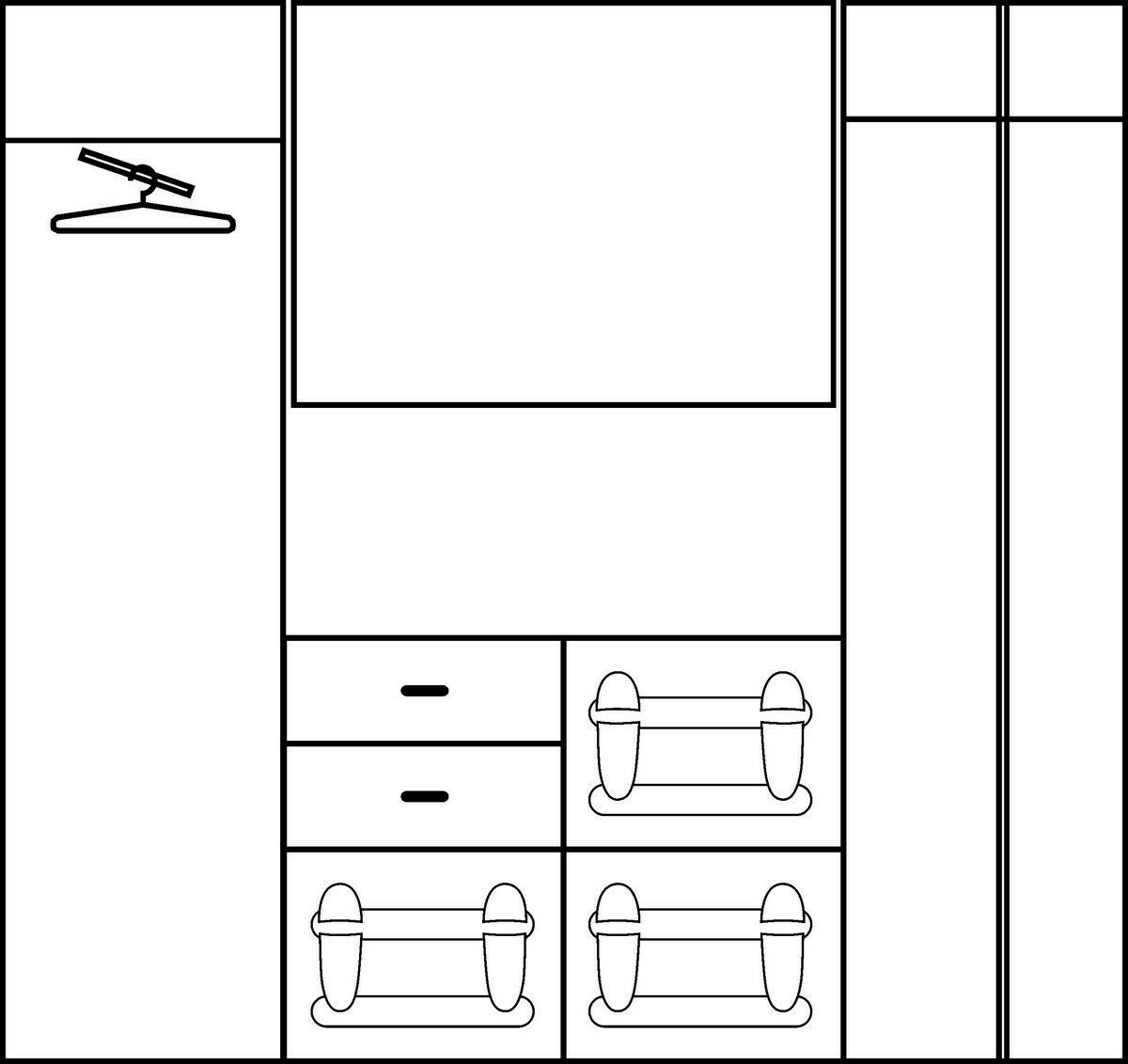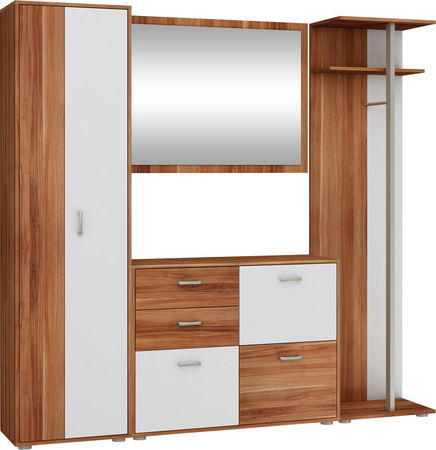 Elegantní předsíň s dostatkem úložného prostoru. Skládá se z věšákové skříně s jedněmi dveřmi která je uvnitř vybavena věšákovou tyčí. Vedle skříně je botník se dvěma zásuvkami v levém horním rohu. Nad botník se na stěnu upevňuje zrcadlo. Na pravé straně se nachází svislá tyč (šedá barva) upevněna shora ve dvou poličkách a z dola v jedné. Provedení korpusu je švestka a dvířka a zásuvky (fronty) jsou v bílé barvě. Drobné úzké úchyty jsou v šedé barvě.