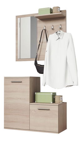 Stylová předsíň Molly nabízí množství úložného prostoru i přes menším rozměrům. Tvoří ji 2 dolní skříňky, z nichž jedna poslouží i jako botník, věšákový panel se třemi háčky na zavěšení oděvu a poličkou na klobouky a čepice. Panel se zrcadlem bude pro Vás také šikovným pomocníkem při chystání se do práce, či na párty.