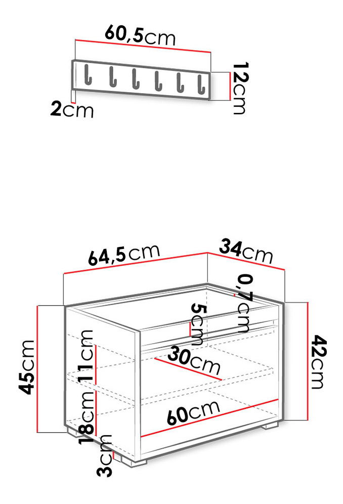 ZobrazitNábytek do předsíně Konkor 60 + čalouněný nástěnný panel je ideální volbou pro ty, kteří hledají pohodlí a styl. Nábytková sestava Konkor slouží k zajímavějšímu a praktičtějšímu uspořádání předsíně. Kombinace botníku s panelem, na kterém jsou uchyceny ramínka, zlepšuje funkčnost prostoru. Urostlá skříň navíc nezabere mnoho místa, umožní pohodlné přezouvání a zavěšení bundy po návratu z města, práce či rodinného výletu. Vrchní část skříně je obložena měkkým čalouněným panelem. Jeho barvy můžete sladit s ostatními prvky dekoru pomocí barev, které jsme připravili. Rozměry: Skříňka na boty Konkor 60: šířka: 64 cm, výška: 45 cm, hloubka: 34 cm, Věšák na šaty 60: šířka: 60 cm, výška: 12 cm, hloubka: 2 cm, Čalouněný panel Pag 60x30: šířka: 60 cm, výška: nábytku: dřevotříska o tloušťce 16 mm, obyčejné panty, žádné rukojeti: otevírání „zezadu“, stříbrné plastové nohy, horní část skříňky má hranu, která drží čalouněné panely (není třeba je lepit na tělo skříňky), věšák obsahuje 6 háků na oblečení + 3 cm silná pěna T18 + látka, tvar: obdélník, 3D efekt, chrání stěny před poškozením, zvukotěsný, použití: uvnitř, panely ideální k dokončení stěny, například jako čelo postele nad postelí Záruka: 24 měsíců