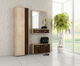 ZobrazitPředsíň skládající se ze 3 dílů, které se mohou libovolně umístit v prostoru nebo těsně vedle sebe. Komoda nebo botník na obrázku vpravo dole má jednu zásuvku. Nad ním je na stěně upevněné zrcadlo s hrubým rámem, které má na spodní straně 2 drobné zásuvky. Na obrázku nalevo je vysoká skříň s jedněmi dveřmi. Sestava stojí na drobných šedých nožkách a je vybavena hranatými šedými úchyty. Provedení je dub sonoma světlá a dub sonoma tmavá.