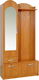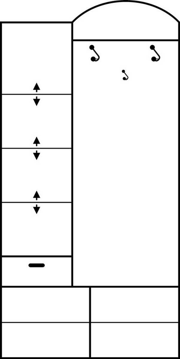 ZobrazitDvoudílná předsíň nebo skříň s klasickými dveřmi se zrcadlem a zásuvkami na levé straně. Na spodku pod levou skříňkou se nachází zásuvka. Na straně pravé se nacházejí 3 háčky a jedna polička umístěná pod horní deskou. Na spodku se nachází jeden společný prostor pro oba díly otevíratelný dvěma úchyty. Předsíň má oba díly v horní části zaoblené. Provedení olše a buk.