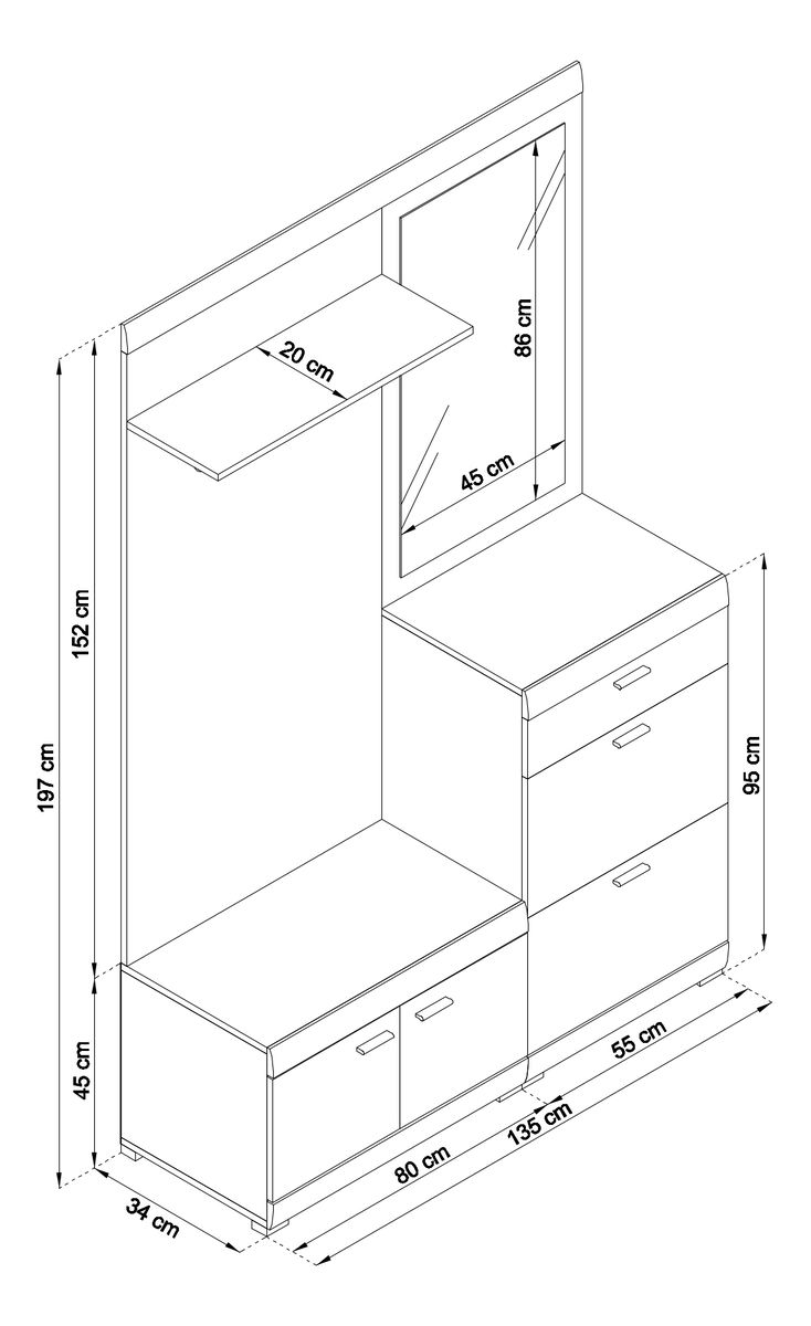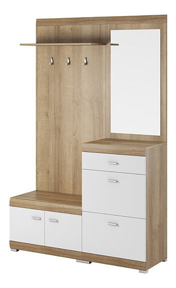 ZobrazitPředsíň je k dispozici v moderní barvě, díky které získá vaše předsíň moderní vzhled. Nabízí prostor pro boty, drobnosti a zavěšení kabátů. Užitečným doplňkem je i police v levé horní části. Zrcadlo je průměrné velikosti.
