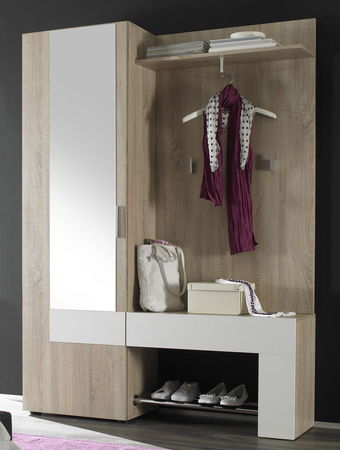 Luxusní předsíň s moderním designem je vhodná na zařízení zejména menších předsíní. Šatní skříň s věšákovým prostorem má na dveřích umístěno velké zrcadlo. Věšákový panel má ve spodní části otevřený botník. Je vyráběna z laminované DTD v barevném provedení dřeva dub sonoma v kombinaci s bílou barvou.