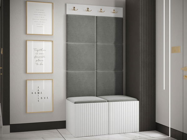ZobrazitPředsíň Tewarota Slim IV s botníkem, věšáky a čalouněnými panely je funkčním a elegantním řešením pro uložení oblečení a obuvi. Místo na boty se nachází ve spodní části nábytku a je vybaveno dvířky, za kterými se ukrývají poličky, které poskytují další základ pro vaše věci. Frézované fronty tohoto modelu dodávají hale nevšední charakter. Věšáky v horní části předsíně umožňují pohodlné uložení svrchního oblečení, jako jsou kabáty nebo bundy. Čalouněné panely plní dekorativní funkci, ale zároveň chrání stěny před nečistotami a poškozením. Navíc jsou i ideálním místem k sezení, které vám usnadní obouvání či přebalování. Taková předsíň vám umožňuje uspořádat prostor a poskytuje stylový vzhled místnosti.