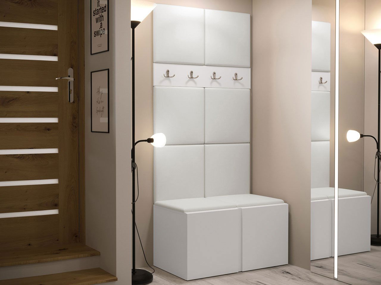 Předsíň Tavasz je kombinací dekorativních prvků Skříňka na boty: šířka: 84 cm, výška: 42 cm, hloubka: 46 cm, Věšák na šaty 84: šířka: 84 cm, výška: 16 cm, hloubka: 4,6 cm, Čalouněný panel Pag 42x42: (x8) šířka: 42 cm, výška: 42 cm, hloubka: 4 cm