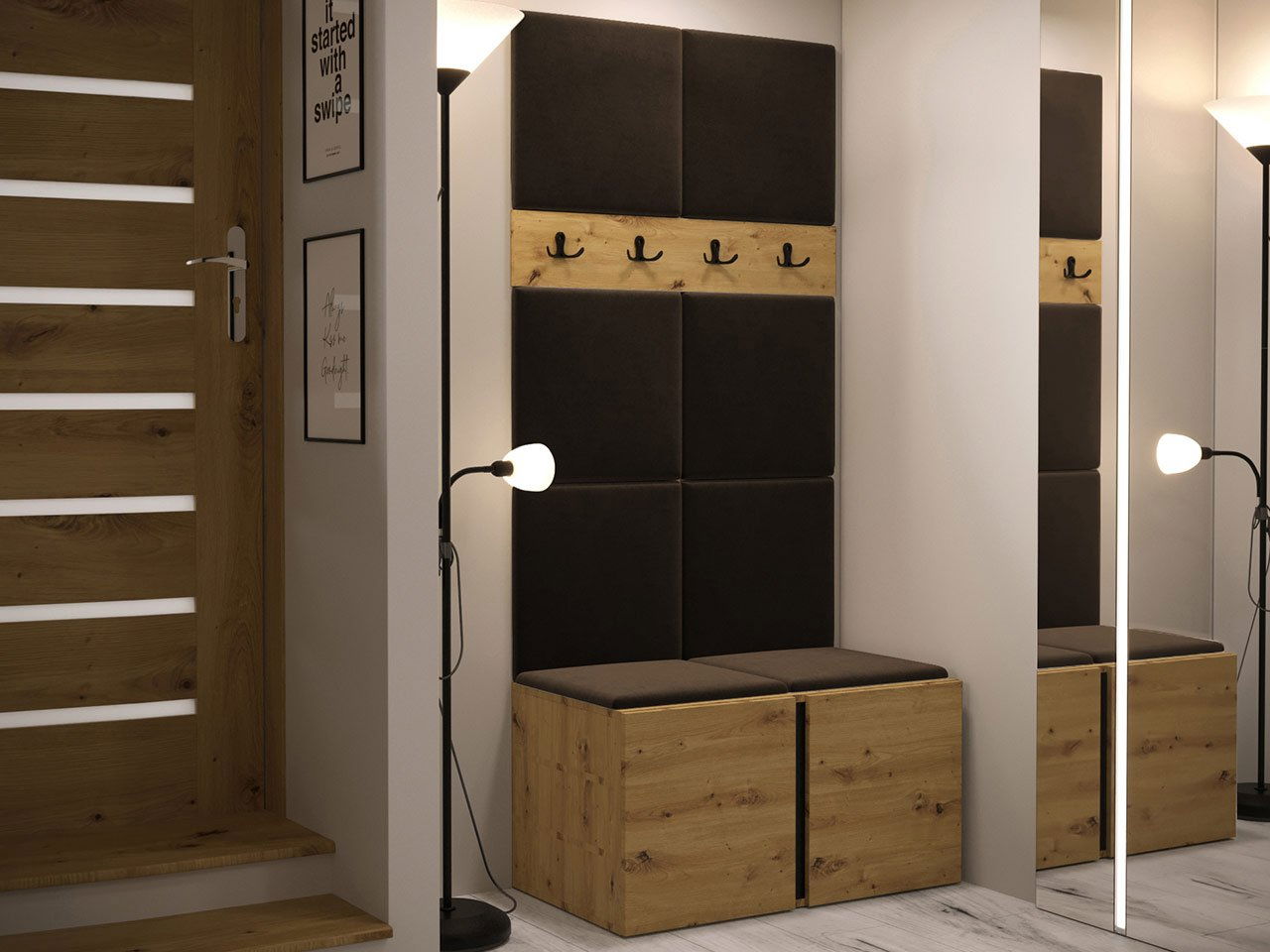 Předsíň Tavasz je kombinací dekorativních prvků Skříňka na boty: šířka: 84 cm, výška: 42 cm, hloubka: 46 cm, Věšák na šaty 84: šířka: 84 cm, výška: 16 cm, hloubka: 4,6 cm, Čalouněný panel Pag 42x42: (x8) šířka: 42 cm, výška: 42 cm, hloubka: 4 cm