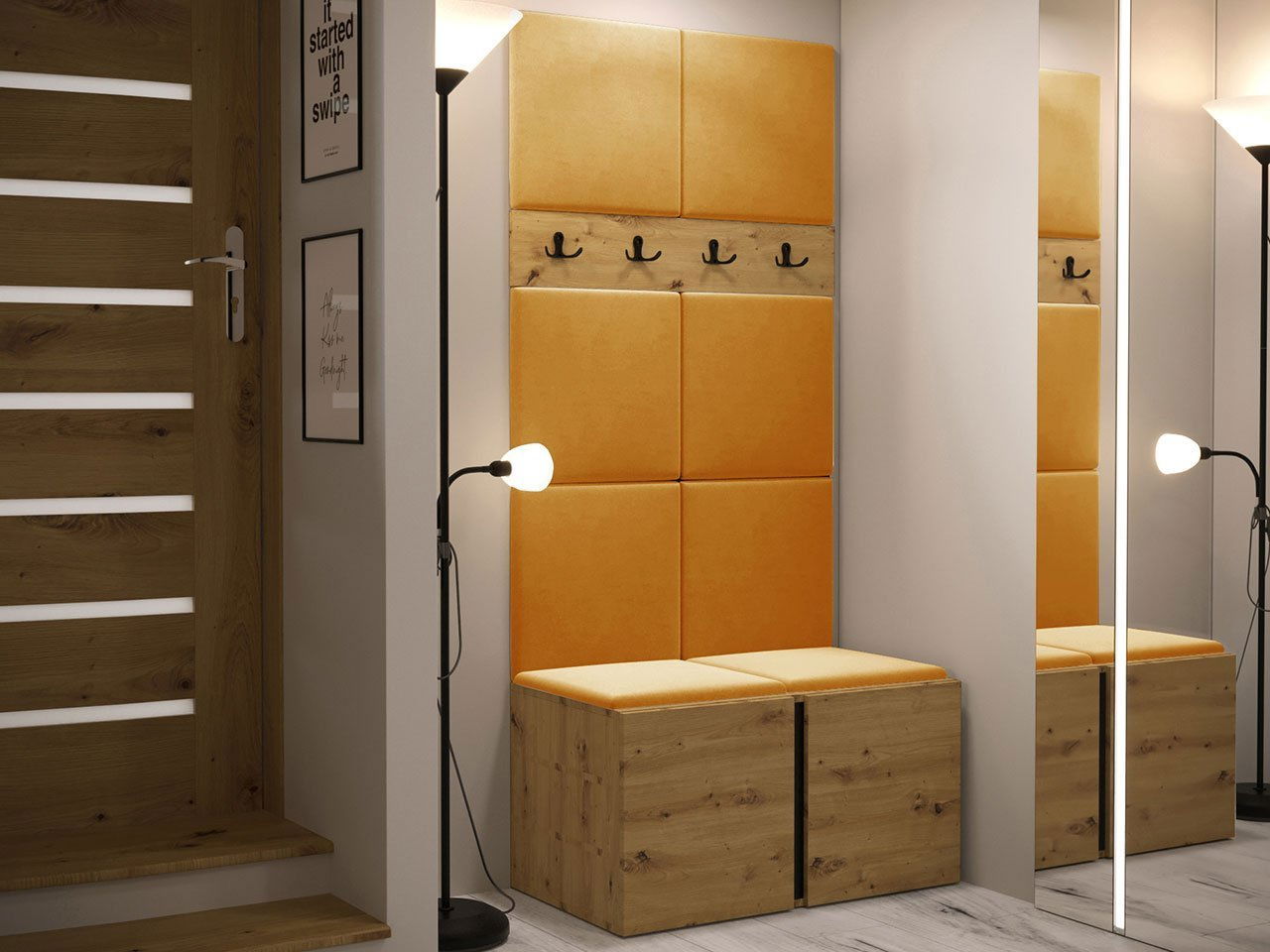 Předsíň Tavasz je kombinací dekorativních prvků Skříňka na boty: šířka: 84 cm, výška: 42 cm, hloubka: 46 cm, Věšák na šaty 84: šířka: 84 cm, výška: 16 cm, hloubka: 4,6 cm, Čalouněný panel Pag 42x42: (x8) šířka: 42 cm, výška: 42 cm, hloubka: 4 cm