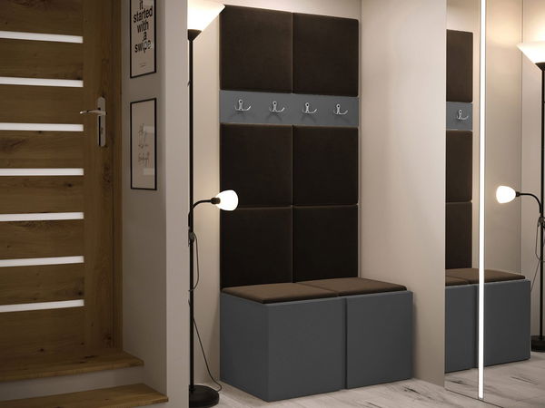 Předsíň Tavasz je kombinací dekorativních prvků Skříňka na boty: šířka: 84 cm, výška: 42 cm, hloubka: 46 cm, Věšák na šaty 84: šířka: 84 cm, výška: 16 cm, hloubka: 4,6 cm, Čalouněný panel Pag 42x42: (x8) šířka: 42 cm, výška: 42 cm, hloubka: 4 cm