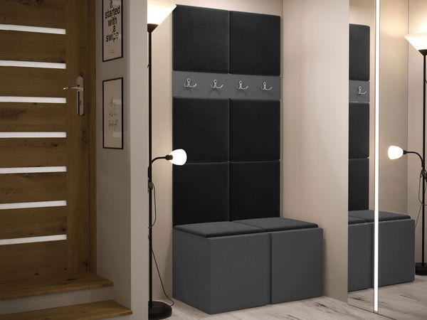 Předsíň Tavasz je kombinací dekorativních prvků Skříňka na boty: šířka: 84 cm, výška: 42 cm, hloubka: 46 cm, Věšák na šaty 84: šířka: 84 cm, výška: 16 cm, hloubka: 4,6 cm, Čalouněný panel Pag 42x42: (x8) šířka: 42 cm, výška: 42 cm, hloubka: 4 cm