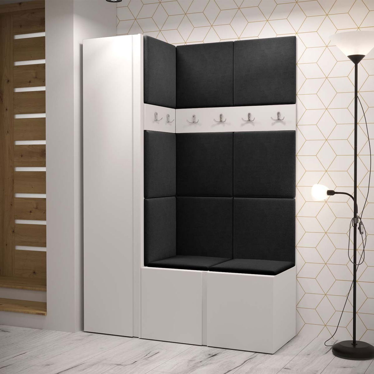 Šatník: šířka: 40 cm, výška: 186 cm, hloubka: 46 cm, Skříňka na boty: šířka: 84 cm, výška: 42 cm, hloubka: 46 cm, Věšák na šaty 84: šířka: 84 cm, výška: 16 cm , hloubka: 4,6 cm, Věšák na šaty 42: šířka: 42 cm, výška: 16 cm, hloubka: 4,6 cm, Čalouněný panel Pag 42x42x11: šířka: 42 cm, výška: 42 cm, hloubka: 4 cm