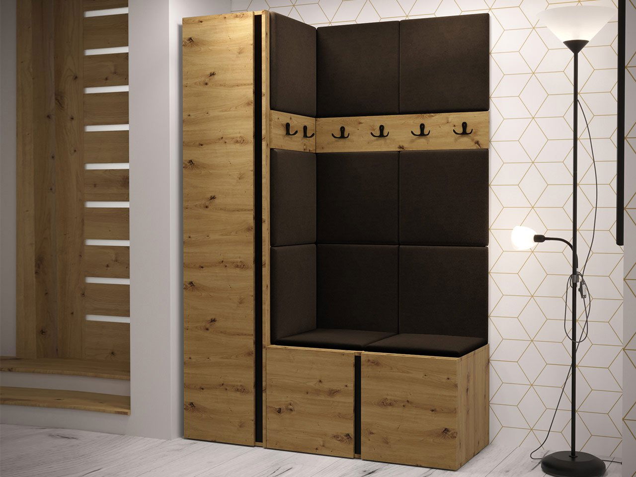 ZobrazitŠatní skříň Timothy je modelem pro speciální úkoly. Díky ní si zorganizujete byt a když půjdete do práce, školy či na nákupy, budete mít to nejpotřebnější vždy po ruce. Předsíňový set obsahuje: šatní skříň, botník, dva věšáky na šaty a čalouněný panel. Celá věc je velmi funkční, ale má také dekorativní hodnotu. Vzhledem k tomu, že se jedná o rohový model, bude perfektní do nerozvinutého koutu. Dostupné v mnoha barvách. Předsíňová skříňka Timothy se sedákem je moderním řešením do každé domácnosti. Díky ní si boty pohodlně obujete. Kabát či bunda budete mít vždy po ruce.