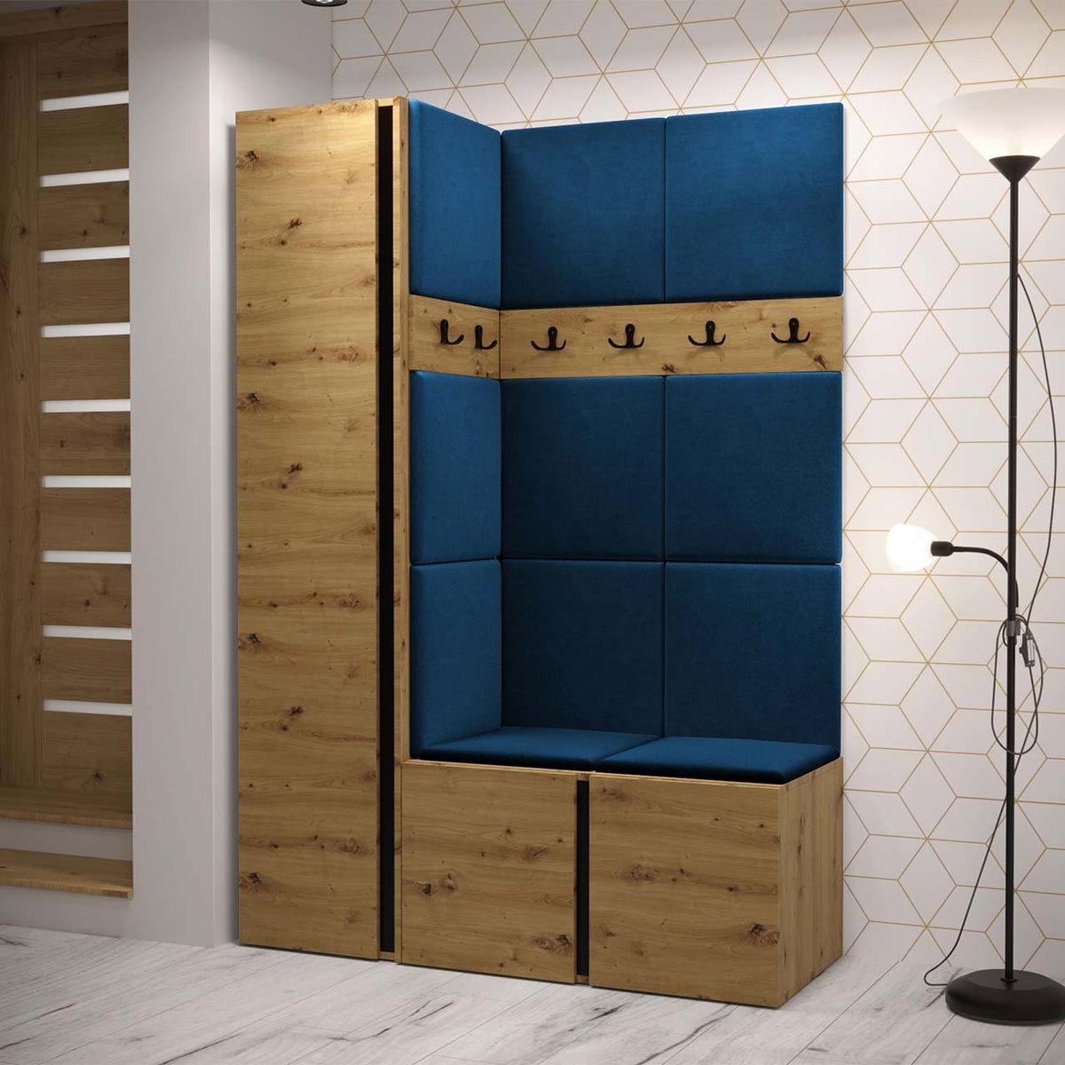 ZobrazitŠatní skříň Timothy je modelem pro speciální úkoly. Díky ní si zorganizujete byt a když půjdete do práce, školy či na nákupy, budete mít to nejpotřebnější vždy po ruce. Předsíňový set obsahuje: šatní skříň, botník, dva věšáky na šaty a čalouněný panel. Celá věc je velmi funkční, ale má také dekorativní hodnotu. Vzhledem k tomu, že se jedná o rohový model, bude perfektní do nerozvinutého koutu. Dostupné v mnoha barvách. Předsíňová skříňka Timothy se sedákem je moderním řešením do každé domácnosti. Díky ní si boty pohodlně obujete. Kabát či bunda budete mít vždy po ruce.