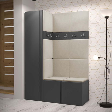 ZobrazitŠatní skříň Timothy je modelem pro speciální úkoly. Díky ní si zorganizujete byt a když půjdete do práce, školy či na nákupy, budete mít to nejpotřebnější vždy po ruce. Předsíňový set obsahuje: šatní skříň, botník, dva věšáky na šaty a čalouněný panel. Celá věc je velmi funkční, ale má také dekorativní hodnotu. Vzhledem k tomu, že se jedná o rohový model, bude perfektní do nerozvinutého koutu. Dostupné v mnoha barvách. Předsíňová skříňka Timothy se sedákem je moderním řešením do každé domácnosti. Díky ní si boty pohodlně obujete. Kabát či bunda budete mít vždy po ruce.