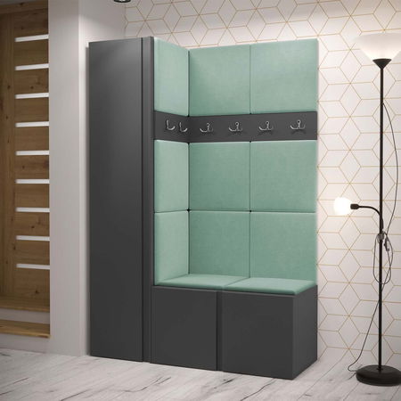 Šatník: šířka: 40 cm, výška: 186 cm, hloubka: 46 cm, Skříňka na boty: šířka: 84 cm, výška: 42 cm, hloubka: 46 cm, Věšák na šaty 84: šířka: 84 cm, výška: 16 cm , hloubka: 4,6 cm, Věšák na šaty 42: šířka: 42 cm, výška: 16 cm, hloubka: 4,6 cm, Čalouněný panel Pag 42x42x11: šířka: 42 cm, výška: 42 cm, hloubka: 4 cm