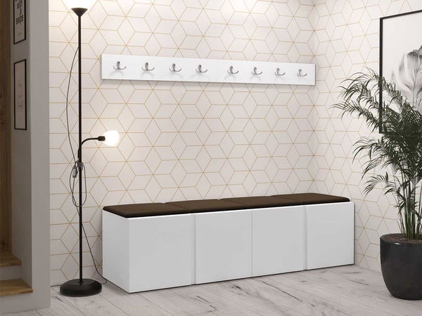 ZobrazitPředstavíme vám kus nábytku, který vnese do vaší předsíně závan čerstvého vzduchu a poskytne obrovské množství místa pro oblečení a obuv pro vás i vaše hosty. Předsíň Timothy má až 8 háků na oblečení. Tento model vám nabízí také čtyři trojité police na všechny druhy bot a pantofle. Suma sumárum, šatní skříň je prostorná a umožní vám udržovat pořádek ve vašem pokoji. Moderní sestava se vyznačuje čalouněnými panely. Poskytnou pohodlné místo při zouvání nebo obouvání. Velké množství dostupných barev vás přinutí vybrat si něco, co se hodí do vaší předsíně. Čalouněná skříň je vyrobena z odolných materiálů, takže vám bude sloužit dlouhá léta.