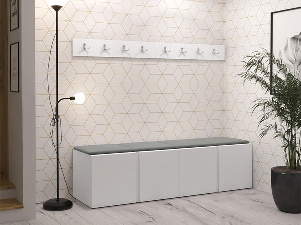 ZobrazitPředstavíme vám kus nábytku, který vnese do vaší předsíně závan čerstvého vzduchu a poskytne obrovské množství místa pro oblečení a obuv pro vás i vaše hosty. Předsíň Timothy má až 8 háků na oblečení. Tento model vám nabízí také čtyři trojité police na všechny druhy bot a pantofle. Suma sumárum, šatní skříň je prostorná a umožní vám udržovat pořádek ve vašem pokoji. Moderní sestava se vyznačuje čalouněnými panely. Poskytnou pohodlné místo při zouvání nebo obouvání. Velké množství dostupných barev vás přinutí vybrat si něco, co se hodí do vaší předsíně. Čalouněná skříň je vyrobena z odolných materiálů, takže vám bude sloužit dlouhá léta.
