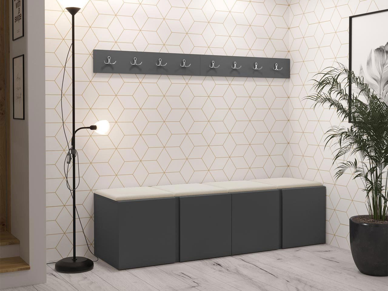 skříň na boty x 2: šířka: 84 cm, výška: 42 cm, hloubka: 46 cm, věšák na oblečení 84 x 2: šířka: 84 cm, výška: 16 cm, hloubka: 4,6 cm, čalouněný panel Pag 42x42 x4 : šířka: 42 cm, výška: 42 cm, hloubka: 4 cm