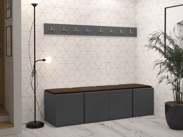 skříň na boty x 2: šířka: 84 cm, výška: 42 cm, hloubka: 46 cm, věšák na oblečení 84 x 2: šířka: 84 cm, výška: 16 cm, hloubka: 4,6 cm, čalouněný panel Pag 42x42 x4 : šířka: 42 cm, výška: 42 cm, hloubka: 4 cm