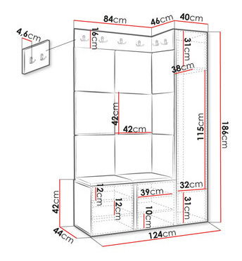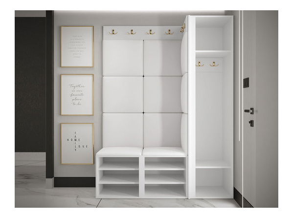 ZobrazitPředsíňová sestava je ideální volbou pro ty, kteří hledají pohodlí a styl. Předsíň Terospito IX je moderní předsíň se sedákem. Krásný styling, dokonale sladěné zlaté prvky a luxusní čalouněný panel vnesou do vašeho interiéru úžasnou auru. Pokud vám záleží na stylovém, estetickém a funkčním kusu nábytku, tato varianta je jistě pro vás! Sestava je vybavena botníkem, poloskříní, věšáky na šaty a nástěnným panelem. Úložný prostor díky šesti policím poskytuje dostatek místa na boty a pantofle pro hosty a šatní skříň a háčky uschovají vaše svrchní oblečení. Kompozice zahrnuje také skříňky na různé doplňky, klobouky a deštníky. Čalouněný panel zatraktivní místnost a dodá jí jedinečnou atmosféru. Rozměry: Skříňka 2D na boty: šířka: 84 cm, výška: 42 cm, hloubka: 46 cm, Věšák na šaty 42: šířka: 42 cm, výška: 16 cm, hloubka: 4,6 cm, Věšák na šaty 84: šířka: 84 cm, polo: 16 cm, výška: 16 cm, 1D: šířka: 40 cm, výška: 186 cm, hloubka: 46 cm, Čalouněný panel Pag 42x42: x11 šířka: 42 cm, výška: 42 cm, hloubka: 4 cm Provedení nábytku: Přední strana: 16 mm silná MDF deska + 16 mm silná 16 mm, hrany zakončené 0,5 mm PVC dýhou, zlaté kovové rukojeti, plastové nohy v barvě korpusu, obyčejné panty, věšáky obsahují 8 dvojháčků Provedení čalouněného panelu: materiál: podložkou panelu je deska o tloušťce 8 mm + 3 cm silná pěna stěny před poškozením, zvukotěsný, způsob montáže: lepidlem, suchým zipem nebo montážní pěnou (v ceně není zahrnuto toto příslušenství, zákazník si jej kupuje sám), aplikace: uvnitř, panely ideální na dokončení stěny Záruka: 24 měsíců