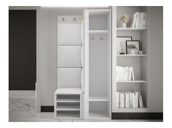 ZobrazitPředsíňová sestava je ideální volbou pro ty, kteří hledají pohodlí a styl. Moderní síňová sestava Terospito XXV s čalouněnými panely skvěle zapadne do prostoru malé i velké předsíně. Mimořádně praktický kus nábytku v sobě spojuje klíčové prvky pro vstup do domu. Základem je jednodvéřová šatní skříň - diskrétní úkryt na kabáty a bundy. Uvnitř jsou také police, které můžete použít k uspořádání galanterie, kabelek nebo klobouků. Součástí sestavy je také botník se sedákem, věšáky a čalouněné panely. Měkce čalouněné kostičky ji po přiložení na zeď ozdobí a ochrání před nečistotami. Rozměry: Skříňka 1D na boty: šířka: 42 cm, výška: 42 cm, hloubka: 46 cm, Věšák na šaty 42: x2 šířka: 42 cm, výška: 16 cm, hloubka: 4,6 cm, Šatní skříň 1D: šířka: 40 cm, výška: 1 Pag 42x42: x7 šířka: 42 cm, výška: 42 cm, hloubka: 4 cm Provedení nábytku: Přední strana: 16 mm silná MDF deska + 16 mm silná dřevotříska, Korpus: dřevotříska o tloušťce 16 mm, hrany zakončené 0,5 mm PVC barvě korpusu, obyčejné panty, věšáky obsahují 6 dvojháčků Provedení čalouněného panelu: materiál: podložkou panelu je deska o tloušťce 8 mm + 3 cm silná pěna T18 + látka, tvar: čtvercový, 3D efekt, chrání stěny před poškozením, zvukotěsný, způsob montáže: lep zahrnuto toto příslušenství, zákazník si jej kupuje sám), aplikace: uvnitř, panely ideální k dokončení stěny Záruka: 24 měsíců