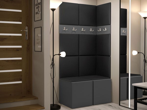 ZobrazitPředsíň Tovenaz I je model, který bude díky sadě čalouněných panelů vypadat skvěle v rohu místnosti. Panely o rozměrech 42 cm x 42 cm jsou vyrobeny z látky příjemné na dotek. Kromě estetické hodnoty budou panely pohodlnou oporou při obouvání bot. Součástí sestavy je také botník s četnými policemi. Na sedadle skříně jsou také čalouněné panely zvyšující její estetickou hodnotu a komfort. Posledním prvkem sestavy je panel se šesti dvojitými ramínky na šaty. Skříňky jsou univerzální, takže je lze namontovat dle přání - vpravo nebo vlevo.