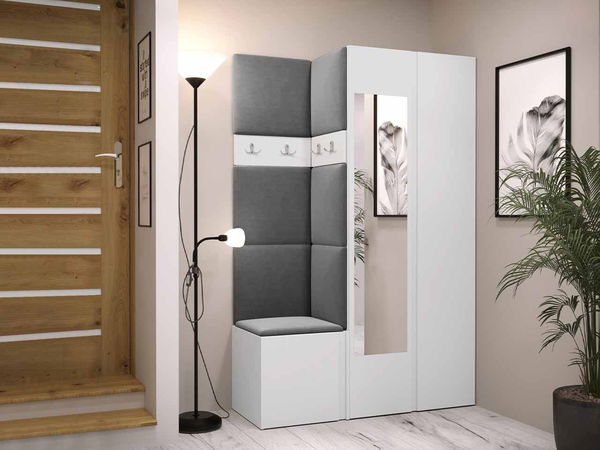 ZobrazitPředsíň je ideální volbou pro ty, kteří hledají pohodlí a styl. Hledáte funkční nábytek, který zorganizuje vaši předsíň? Představujeme předsíň Tavasz XXVI. Tento model nabízí otevřený i uzavřený úložný prostor. Dvojitá šatní skříň se zrcadlem vám umožní uložit velké množství bund, kabátů a jiných oděvů. Botník se sedátkem nabízí kompaktní police na boty. Velkou předností soupravy je čalouněný sedák, který má také dekorativní funkci. Doplnění o čalouněné panely vnáší do interiéru moderní design a výjimečnou útulnost. Celek doplňují ramínka na zavěšení oblečení. Můžeme na ně zavěsit věci, které často používáme, například oblíbenou bundu, klíče či deštník. Rozměry: Skříň se zrcadlem 74: šířka: 74 cm, výška: 186 cm, hloubka: 44 cm, Skříňka na boty: šířka: 42 cm, výška: 42 cm, hloubka: 44 cm,, Věšák na šaty 42: x 2 šířka: 42 cm, výška, 16 cm, výška: 16 cm 42x42: x 7 šířka: 42 cm, výška: 42 cm, hloubka: 4 cm Provedení: 16 mm silná laminovaná deska, okraje jsou zakončeny odolnou 0,5 mm PVC dýhou, která je odolná vůči každodennímu používání, žádné rukojeti, plastové nohy, obyčejné pán čalouněného panelu: materiál: základem panelu je deska o tloušťce 8 mm + 3 cm silná pěna T18 + látka, tvar: čtvercový, 3D efekt, chrání stěny před poškozením, zvukotěsný, aplikace: interiér Záruka: 24 měsíců