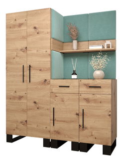 - Materiál a styl. Ať už preferujete provensálský, rustikální nebo moderní styl myslete také na odolnost a materiál předsíňového nábytku. Velmi často bývají předsíňové stěny z laminátu nebo dřevotřísky. Jsou cenově dostupné a můžete si vybrat z široké škály dekorů, např.: dub sonoma nebo oblíbené bílé provedení. Takto je umíte krásně sladit například s podlahou nebo stylovými a praktickými posuvnými dveřmi. Navíc je lze snadno omýt a jsou poměrně odolné. Dřevotříska se vyznačuje jemnou strukturou a velkým výběrem barev.