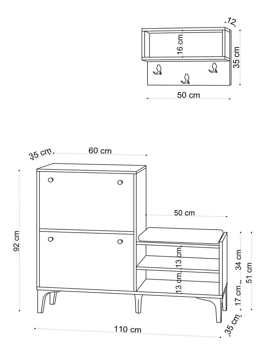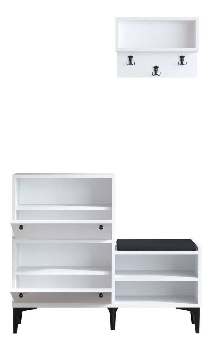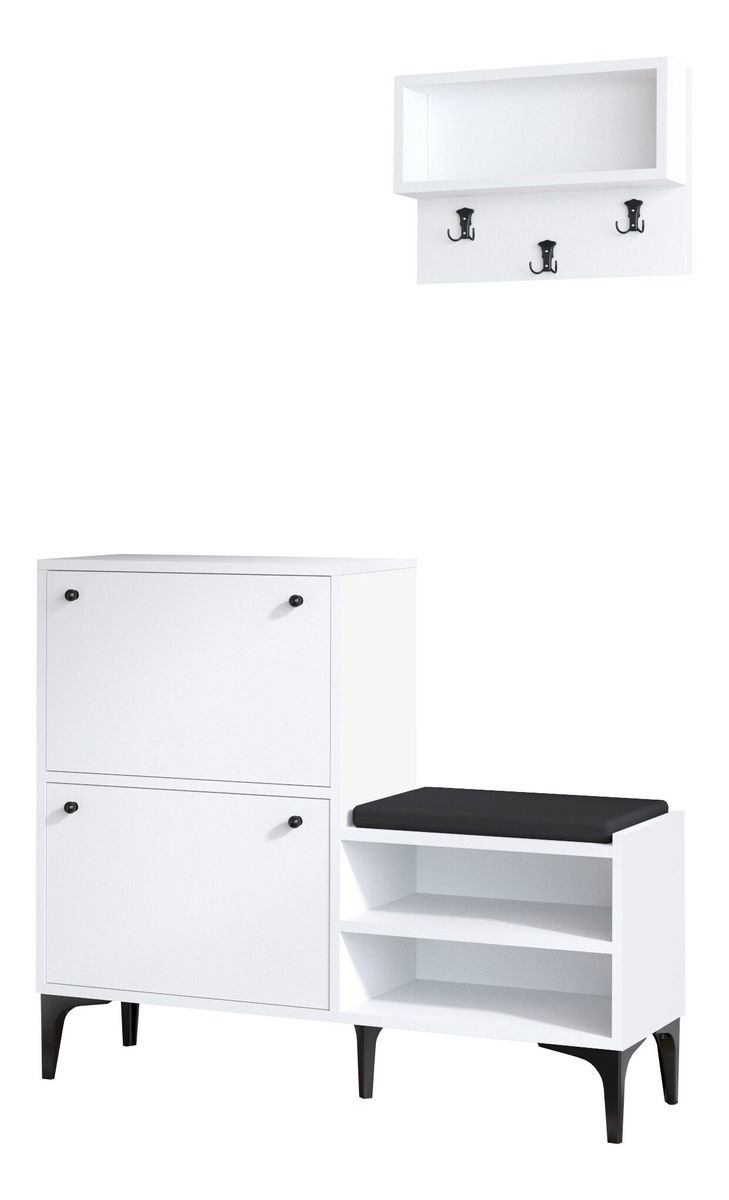 Předsíňová sestava - Fuko je ideálním doplňkem pro vaši předsíň. S výškou 92 cm, šířkou 110 cm a hloubkou 35 cm nabízí dostatek úložného prostoru pro vaše věci. Předsíňová sestava je vyrobena z kvalitního materiálu a je dostupná v kombinaci bílá + černá, což dodává vašemu interiéru stylový vzhled. Sestava je praktická a funkční s širokou škálou policek a zásuvek, kde můžete uspořádat a uschovat své šatstvo a obuv. Navrhněte si svoji předsíň podle svých představ s předsíňovou sestavou Fuko.