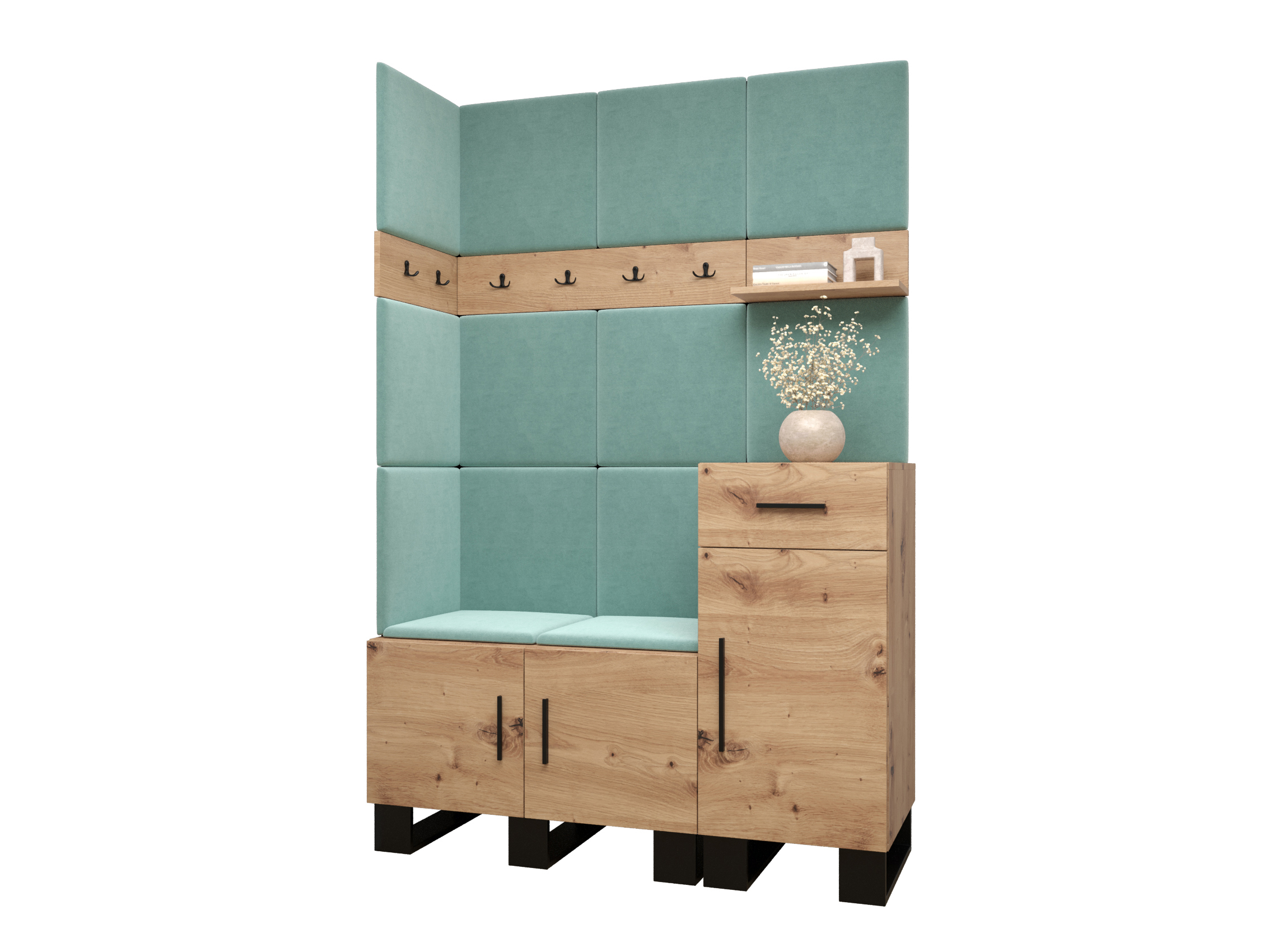 Designová předsíňová sestava Amanda se stane krásným a zejména praktickým doplňkem Vašeho interiéru. Skříňka na boty poslouží pro praktické uložení Vaší obuvi a komoda zase jako úložný prostor pro Vaše osobní věci či drobnosti. O zavěšení Vašich větrovek či kabátů se postará jeden čtyřvěšákový a jeden dvouvěšákový panel. Nástěnná police Vám zase nabídne místo např. pro Vaše dekorace. Moderní akcent síně je zvýrazněn i čalouněnými panely, které předsíni dodávají nejen přitažlivý styl a eleganci, ale také poskytují i ochranu Vašeho nábytku před poškozením a výborné akustické vlastnosti.