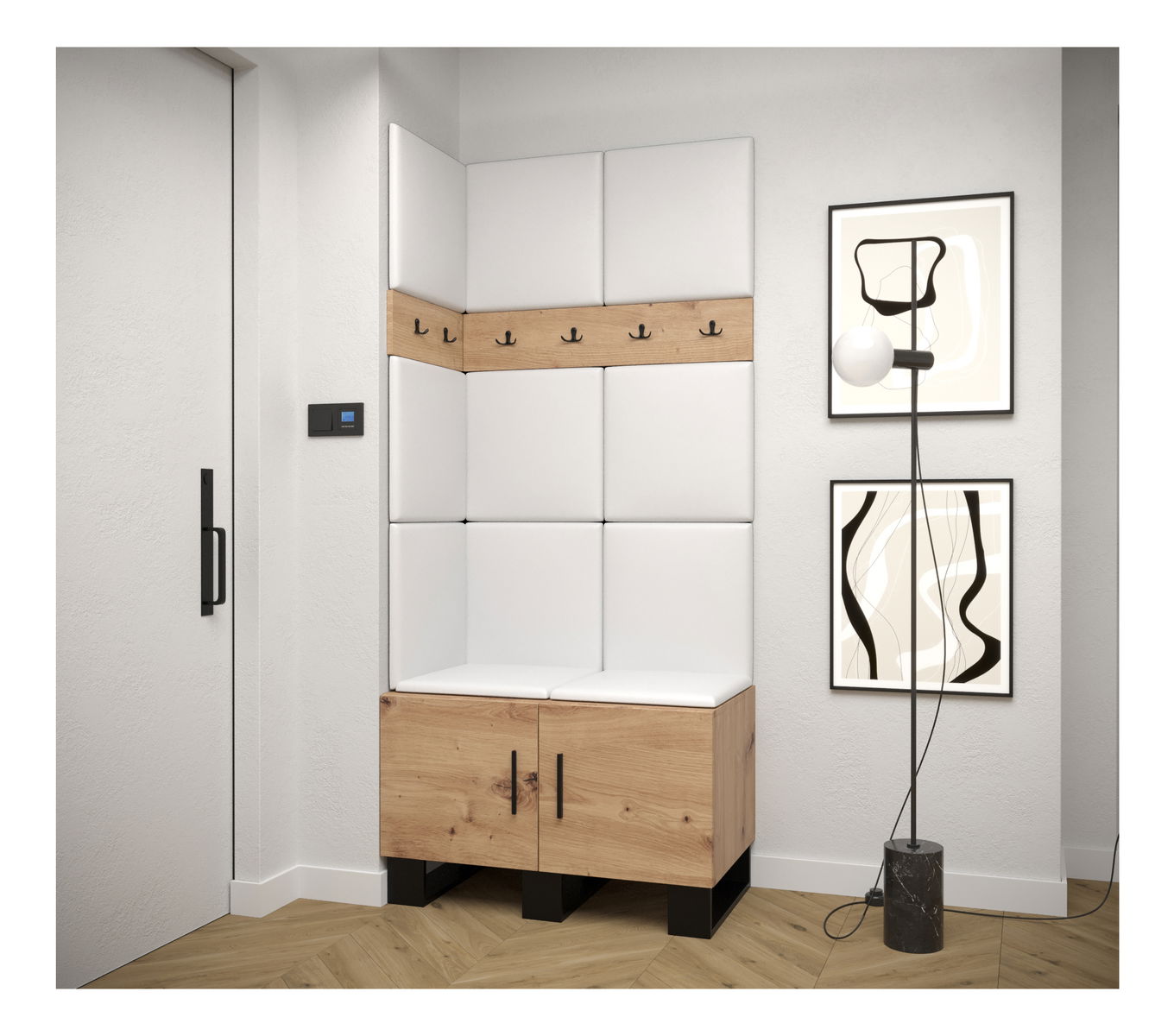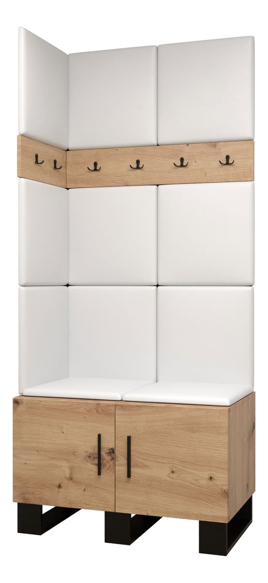 Designová předsíňová sestava Amanda se stane krásným a zejména praktickým doplňkem Vašeho interiéru. Skříňka na boty poslouží pro praktické uložení Vaší obuvi a díky kombinaci jednoho dvouvěšákového a jednoho čtyřvěšákového panelu budete mít také dostatek místa na zavěšení Vašich větrovek či kabátů. Moderní akcent síně je zvýrazněn i čalouněnými panely, které předsíni dodávají nejen přitažlivý styl a eleganci, ale také poskytují i ochranu Vašeho nábytku před poškozením a výborné akustické vlastnosti.