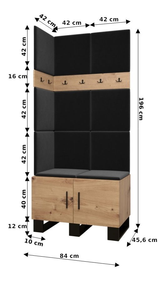 Designová předsíňová sestava Amanda se stane krásným a zejména praktickým doplňkem Vašeho interiéru. Skříňka na boty poslouží pro praktické uložení Vaší obuvi a díky kombinaci jednoho dvouvěšákového a jednoho čtyřvěšákového panelu budete mít také dostatek místa na zavěšení Vašich větrovek či kabátů. Moderní akcent síně je zvýrazněn i čalouněnými panely, které předsíni dodávají nejen přitažlivý styl a eleganci, ale také poskytují i ochranu Vašeho nábytku před poškozením a výborné akustické vlastnosti.