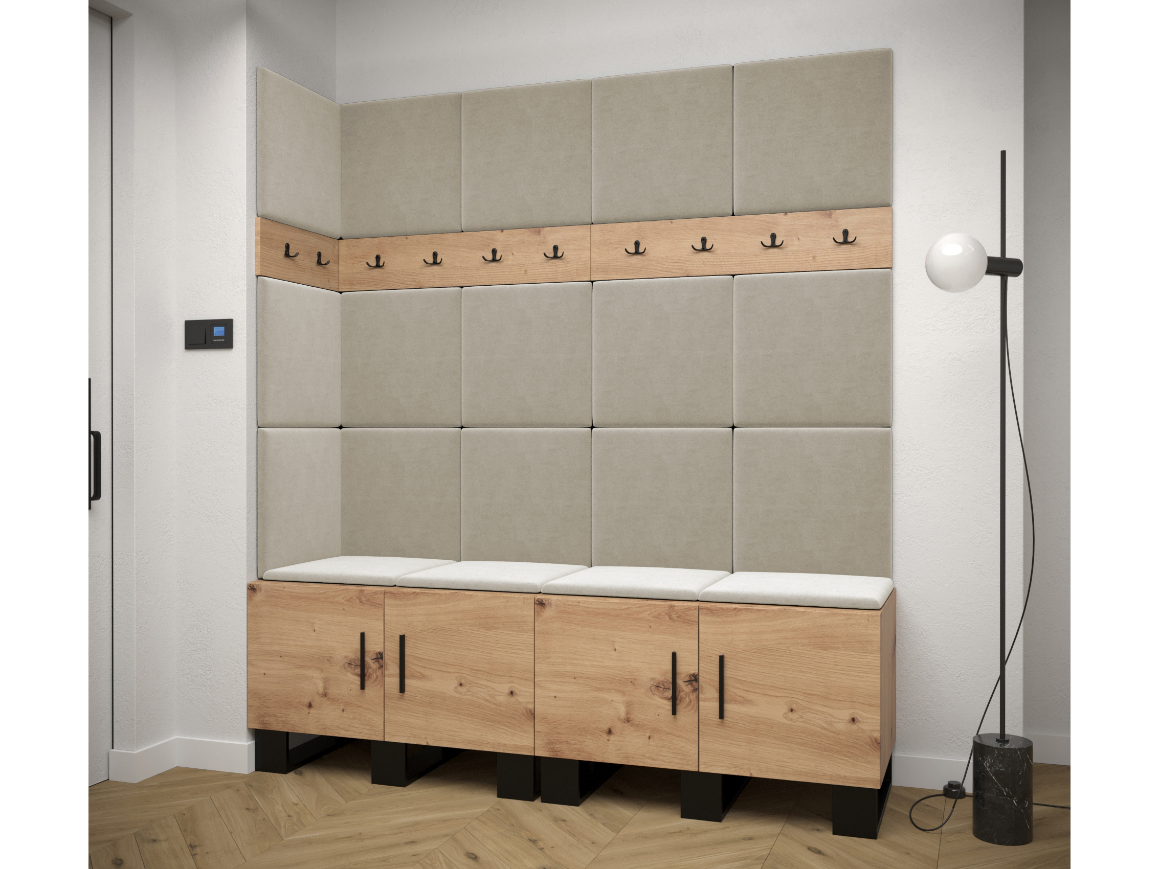 Designová předsíňová sestava Amanda se stane krásným a zejména praktickým doplňkem Vašeho interiéru. Dvojice prostorných skříněk na boty Vám nabídne dostatek místa pro Vaše boty. O zavěšení Vašich větrovek či kabátů se postará dvojice čtyřvěšákových panelů spolu s jedním dvouvěšákovým. Moderní akcent síně je zvýrazněn i čalouněnými panely, které předsíni dodávají nejen přitažlivý styl a eleganci, ale také poskytují i ochranu Vašeho nábytku před poškozením a výborné akustické vlastnosti.