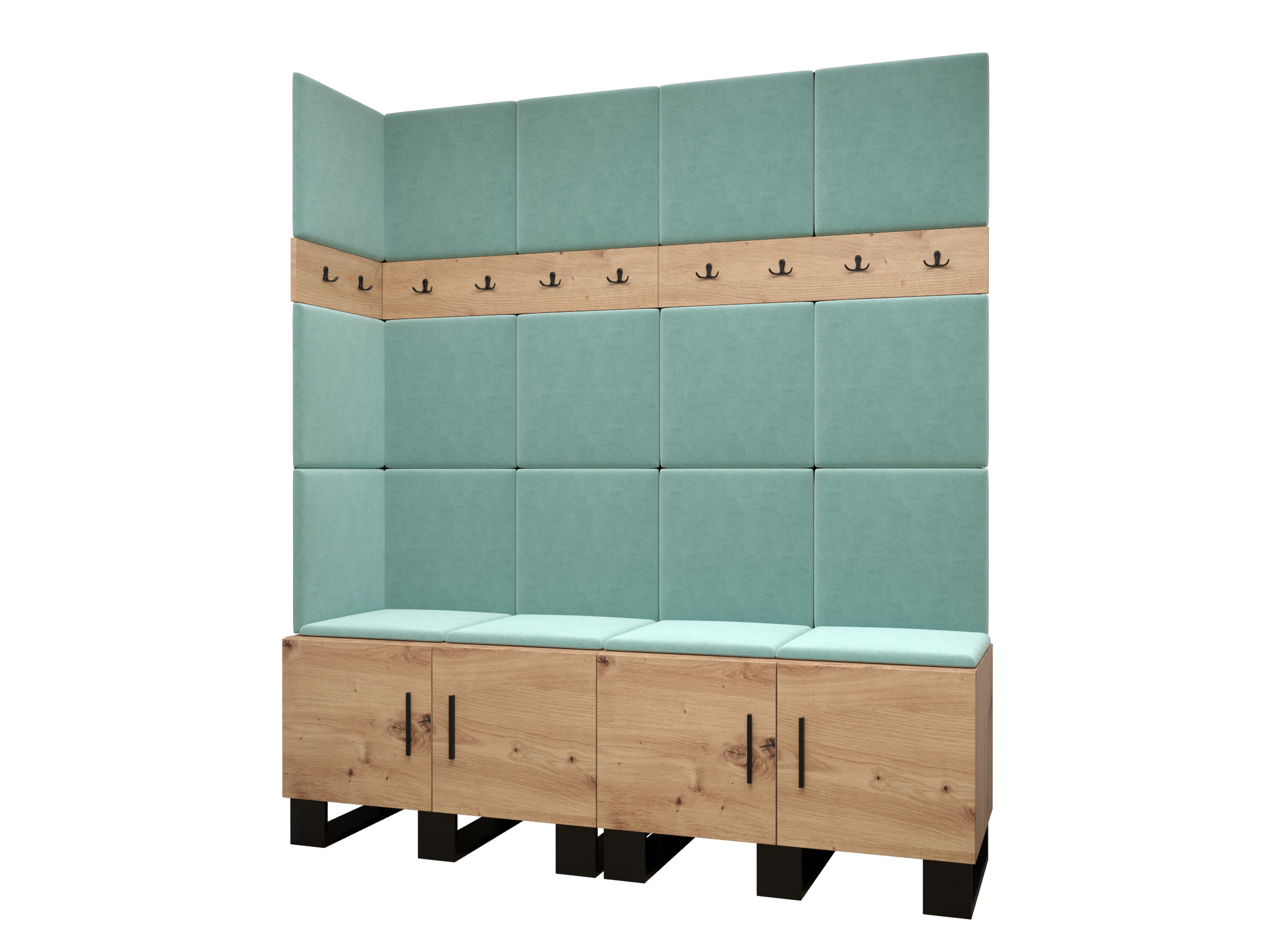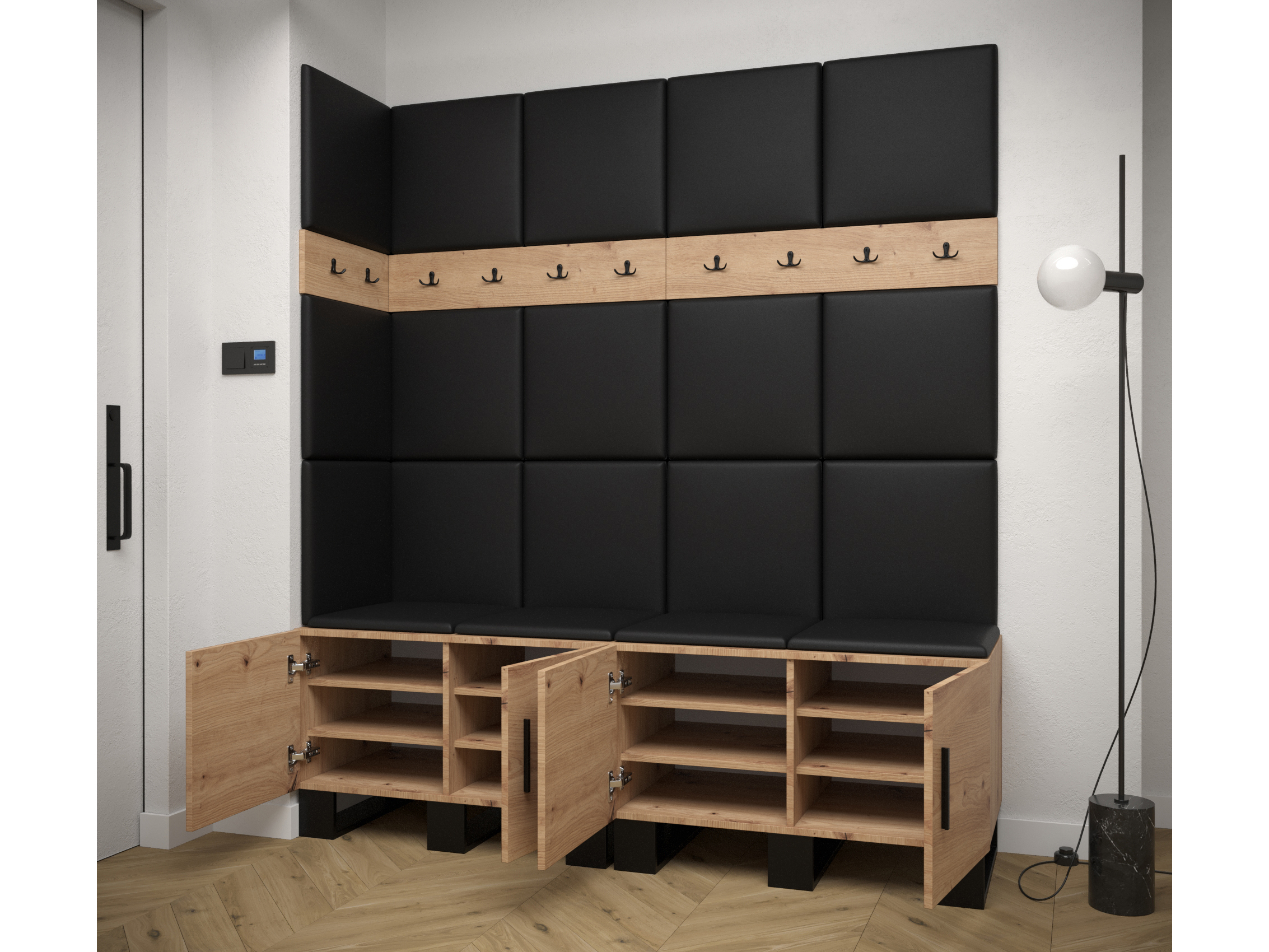 Designová předsíňová sestava Amanda se stane krásným a zejména praktickým doplňkem Vašeho interiéru. Dvojice prostorných skříněk na boty Vám nabídne dostatek místa pro Vaše boty. O zavěšení Vašich větrovek či kabátů se postará dvojice čtyřvěšákových panelů spolu s jedním dvouvěšákovým. Moderní akcent síně je zvýrazněn i čalouněnými panely, které předsíni dodávají nejen přitažlivý styl a eleganci, ale také poskytují i ochranu Vašeho nábytku před poškozením a výborné akustické vlastnosti.