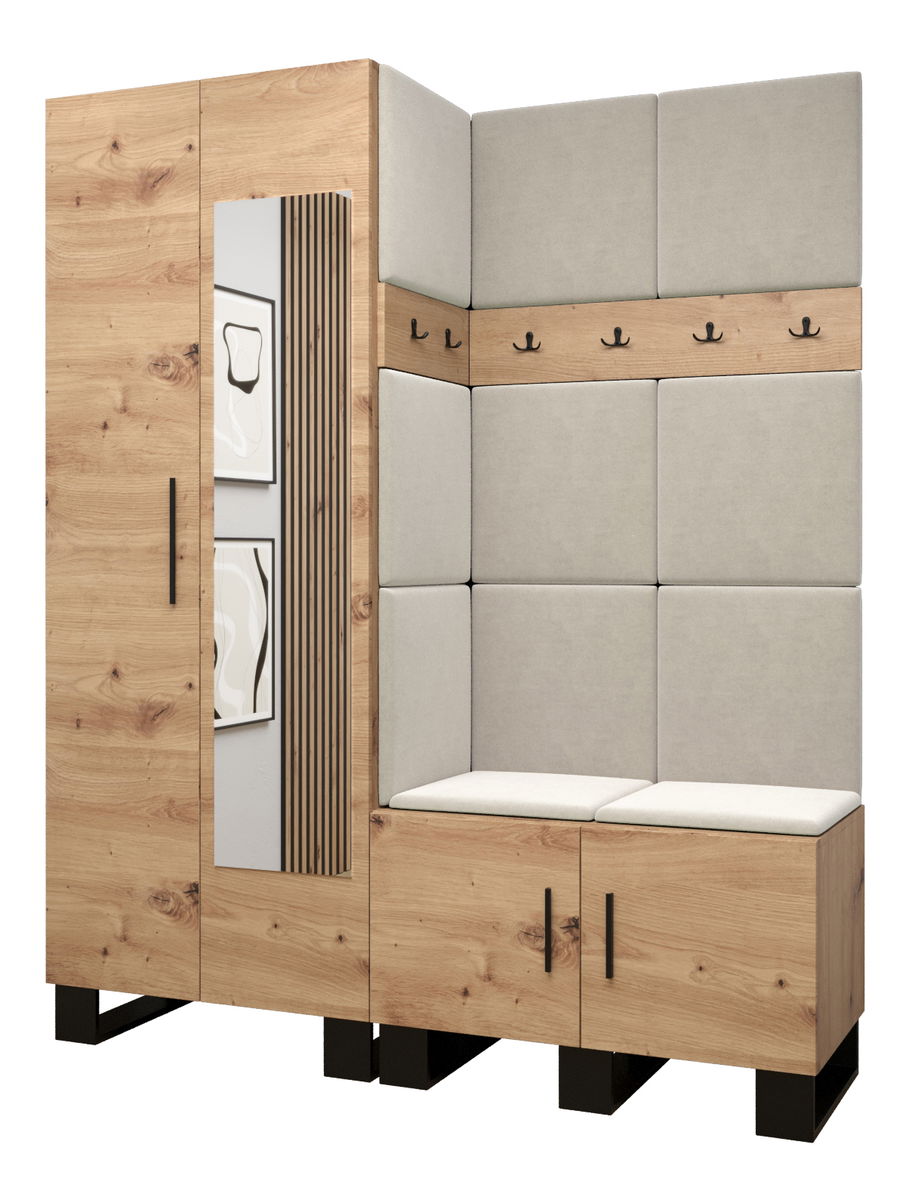 ZobrazitDesignová předsíňová sestava Amanda se stane krásným a zejména praktickým doplňkem Vašeho interiéru. Praktická věšáková skříň s leštěným zrcadlem v kombinaci s jedním čtyřvěšákem a jedním dvojvěšákem se s lehkostí postarají o uložení či zavěšení Vašich větrovek a kabátů. Do malé skříňky se zase vejdou Vaše boty. Moderní akcent síně je zvýrazněn i čalouněnými panely, které předsíni dodávají nejen přitažlivý styl a eleganci, ale také poskytují i ochranu Vašeho nábytku před poškozením a výborné akustické vlastnosti.