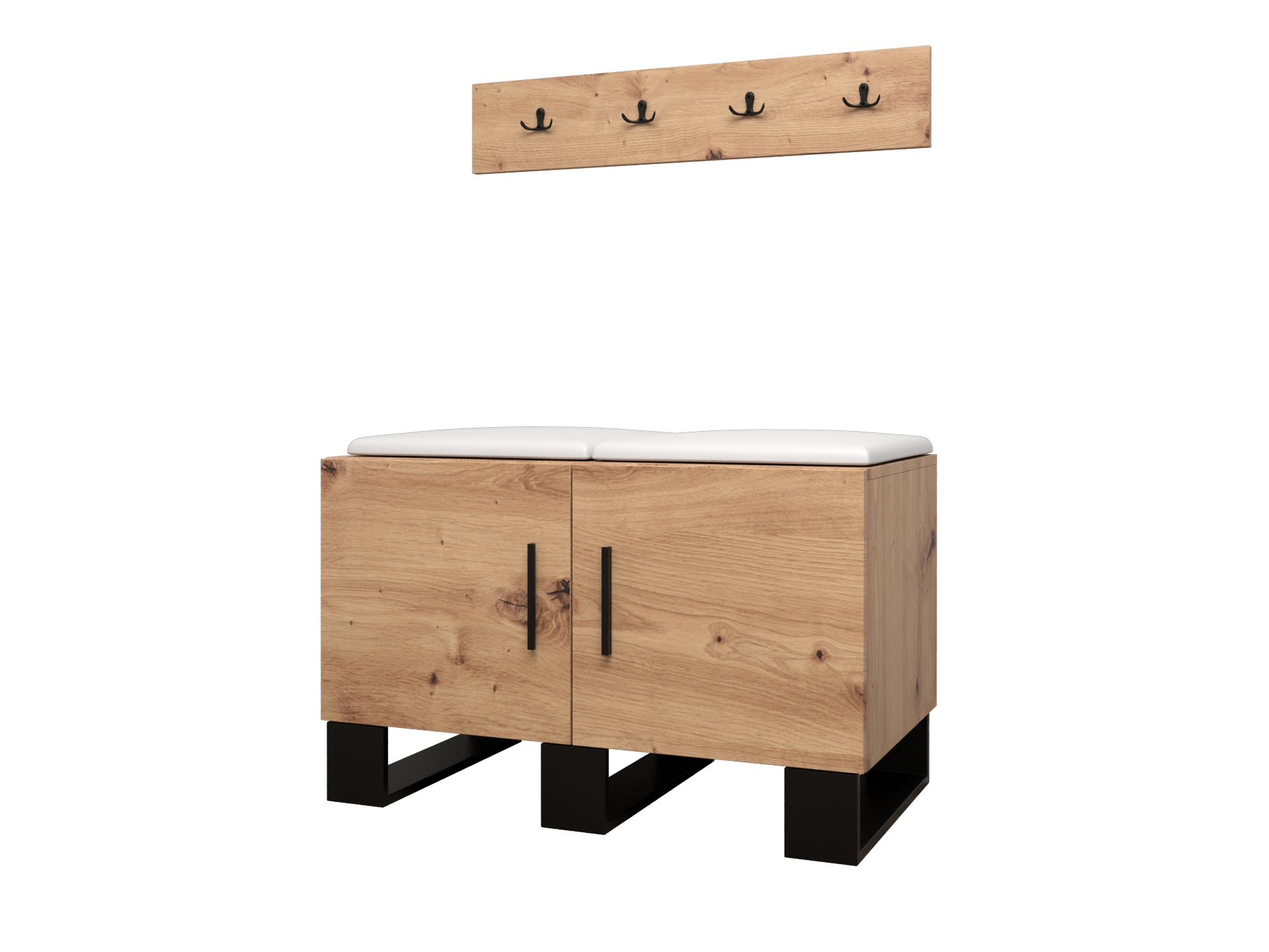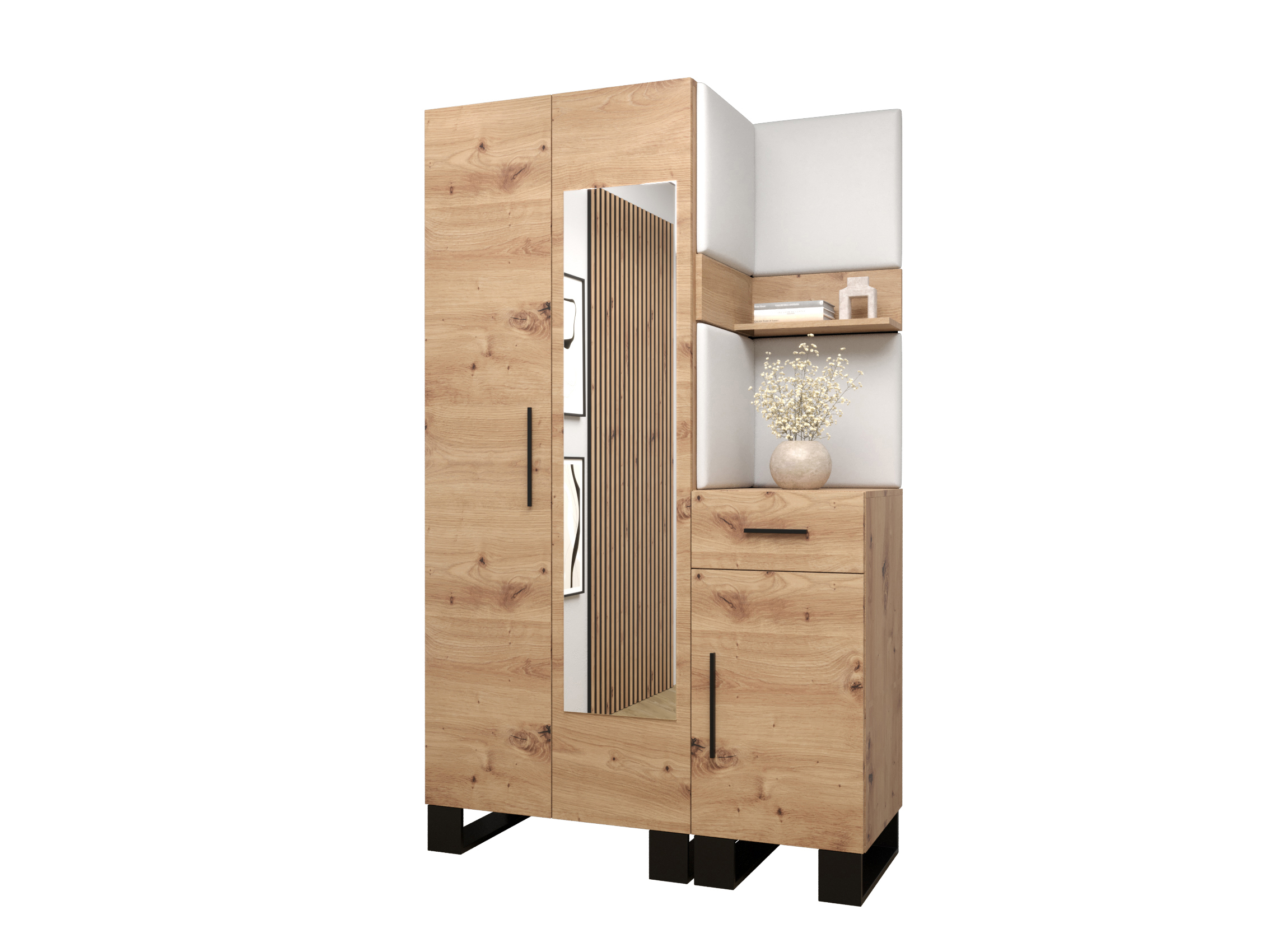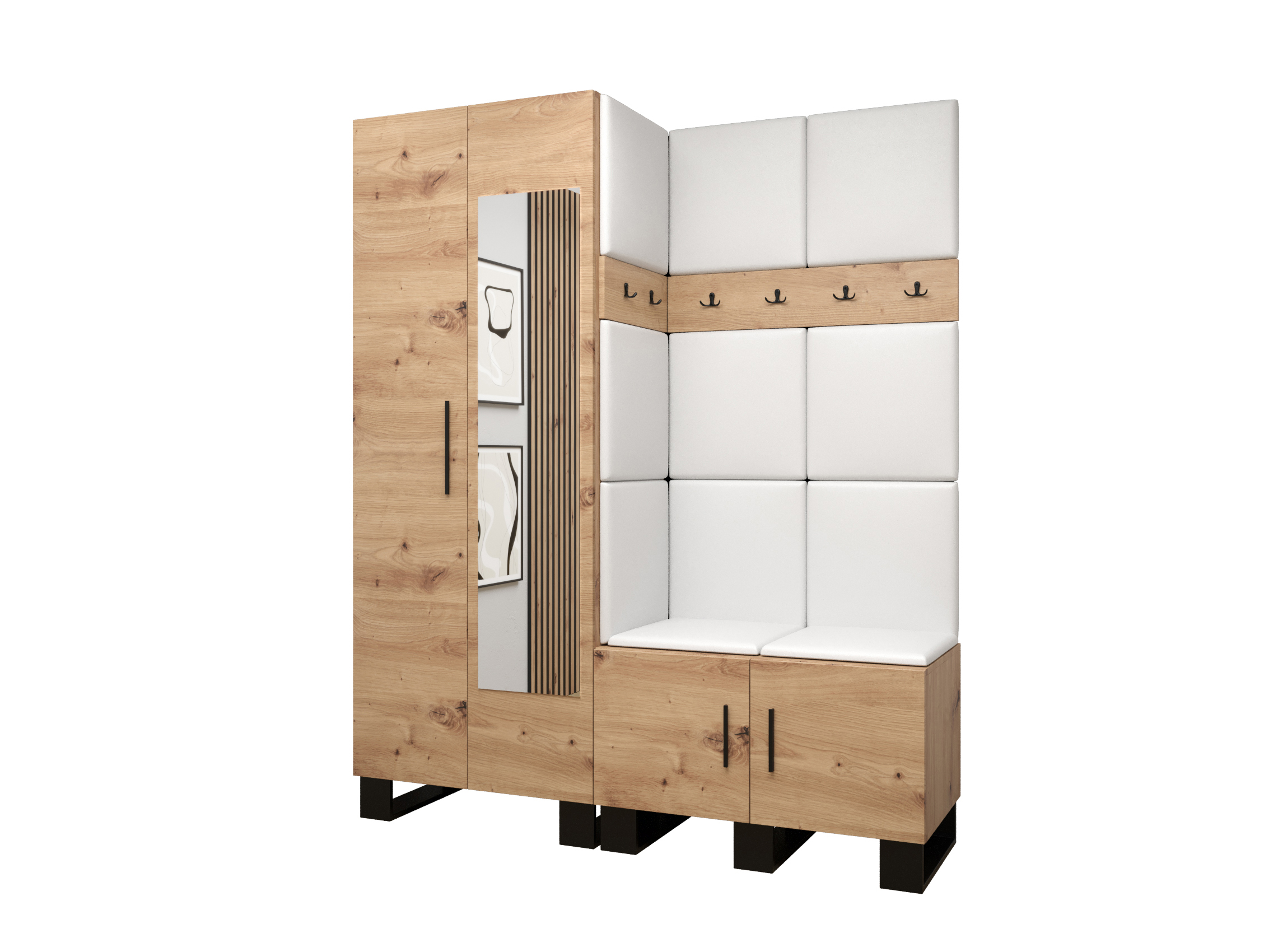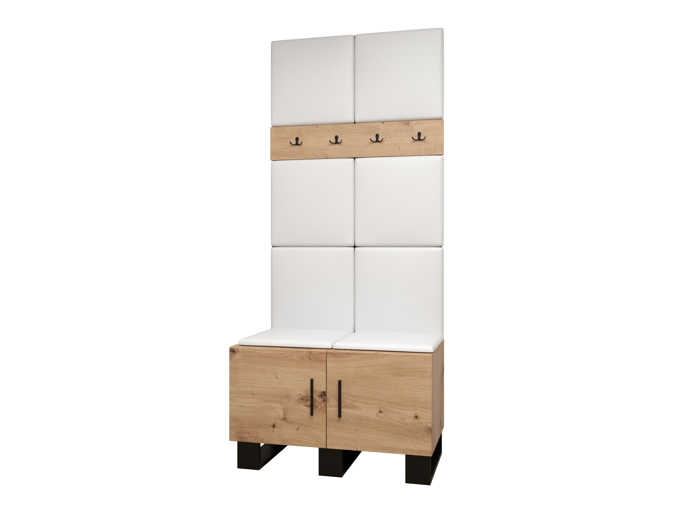 Designová předsíňová sestava Amanda se stane krásným a zejména praktickým doplňkem Vašeho interiéru. Praktická věšáková skříň s leštěným zrcadlem v kombinaci s jedním čtyřvěšákem a jedním dvojvěšákem se s lehkostí postarají o uložení či zavěšení Vašich větrovek a kabátů. Do malé skříňky se zase vejdou Vaše boty. Moderní akcent síně je zvýrazněn i čalouněnými panely, které předsíni dodávají nejen přitažlivý styl a eleganci, ale také poskytují i ochranu Vašeho nábytku před poškozením a výborné akustické vlastnosti.