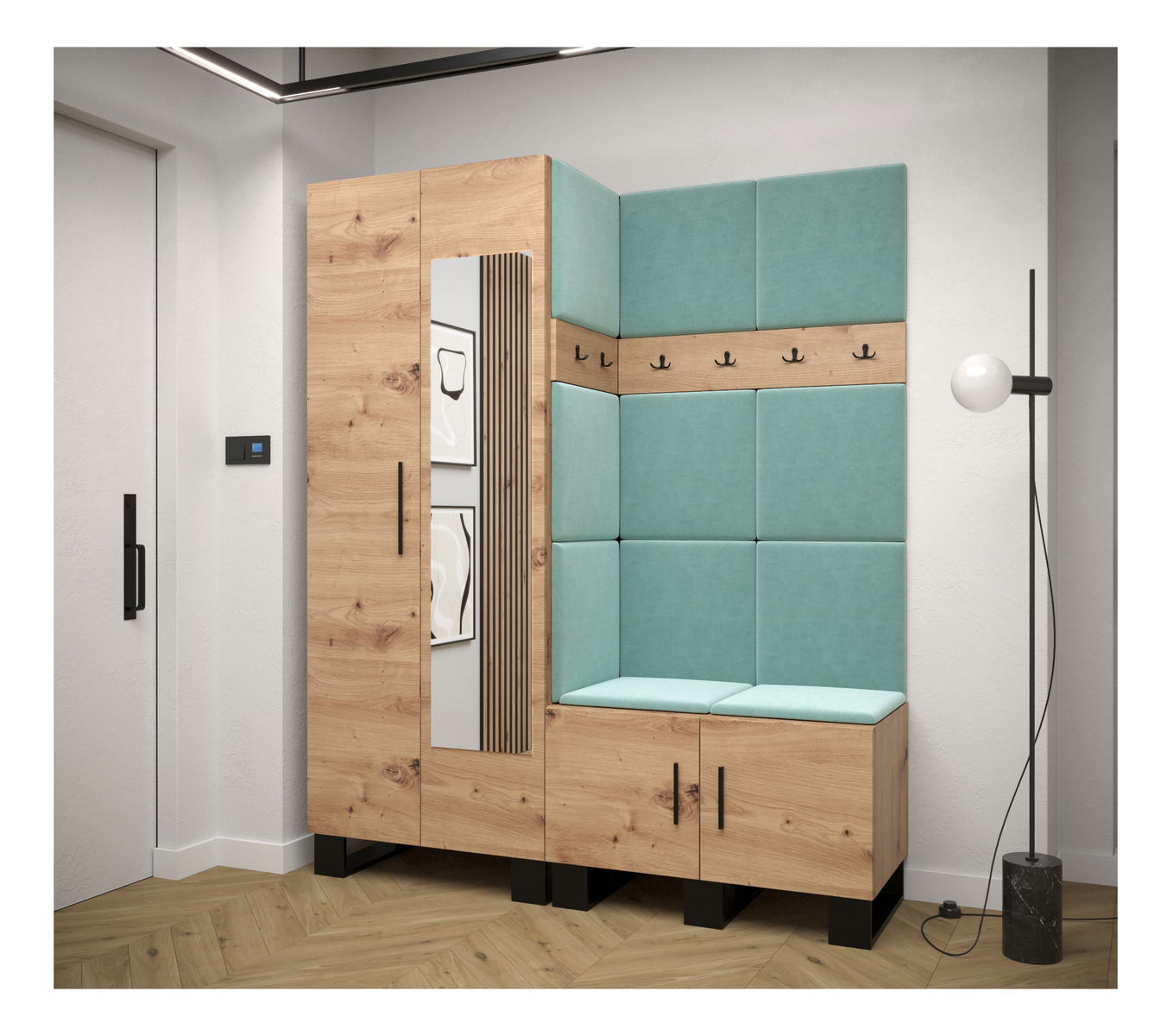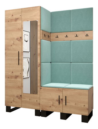 ZobrazitDesignová předsíňová sestava Amanda se stane krásným a zejména praktickým doplňkem Vašeho interiéru. Praktická věšáková skříň s leštěným zrcadlem v kombinaci s jedním čtyřvěšákem a jedním dvojvěšákem se s lehkostí postarají o uložení či zavěšení Vašich větrovek a kabátů. Do malé skříňky se zase vejdou Vaše boty. Moderní akcent síně je zvýrazněn i čalouněnými panely, které předsíni dodávají nejen přitažlivý styl a eleganci, ale také poskytují i ochranu Vašeho nábytku před poškozením a výborné akustické vlastnosti.