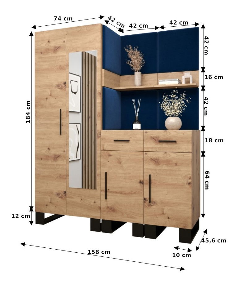 Designová předsíňová sestava Amanda se stane krásným a zejména praktickým doplňkem Vašeho interiéru. Věšáková skříň s leštěným zrcadlem Vám nabídne úložný prostor pro zavěšení Vašeho oblečení a dvojice komod zase velký prostor pro odložení Vašich osobních věcí či drobností. Dvojice praktických nástěnných polic zase nabídne místo např. pro Vaše dekorace. Moderní akcent síně je zvýrazněn i čalouněnými panely, které předsíni dodávají nejen přitažlivý styl a eleganci, ale také poskytují i ochranu Vašeho nábytku před poškozením a výborné akustické vlastnosti.