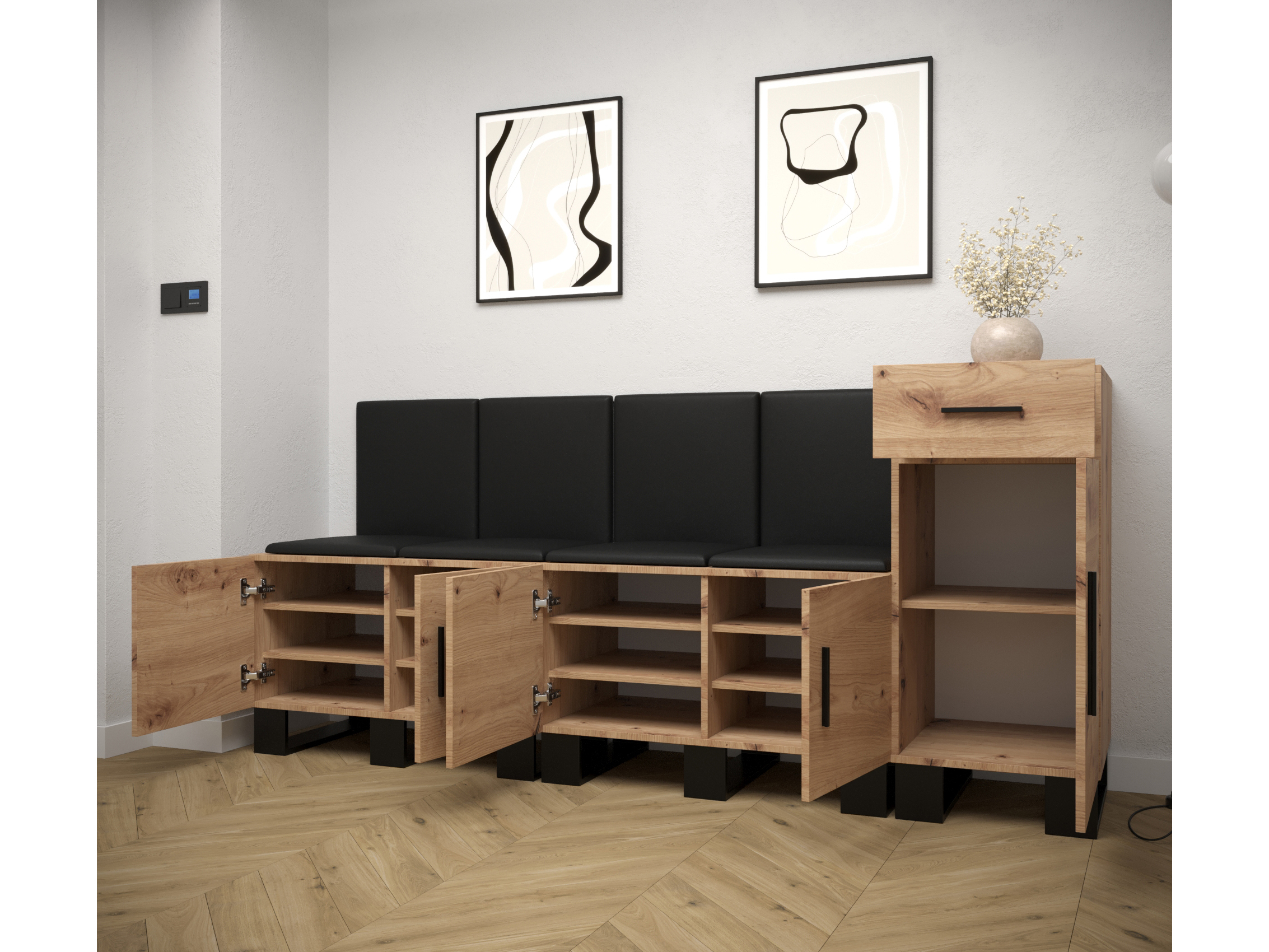 Designová předsíňová sestava Amanda se stane krásným a zejména praktickým doplňkem Vašeho interiéru. Dvojice skříněk na boty v kombinaci s komodou Vám nabídnou velký úložný prostor pro obuv a také Vaše osobní věci či drobnosti. Moderní akcent síně je zvýrazněn i čalouněnými panely, které předsíni dodávají nejen přitažlivý styl a eleganci, ale také poskytují i ochranu Vašeho nábytku před poškozením a výborné akustické vlastnosti.