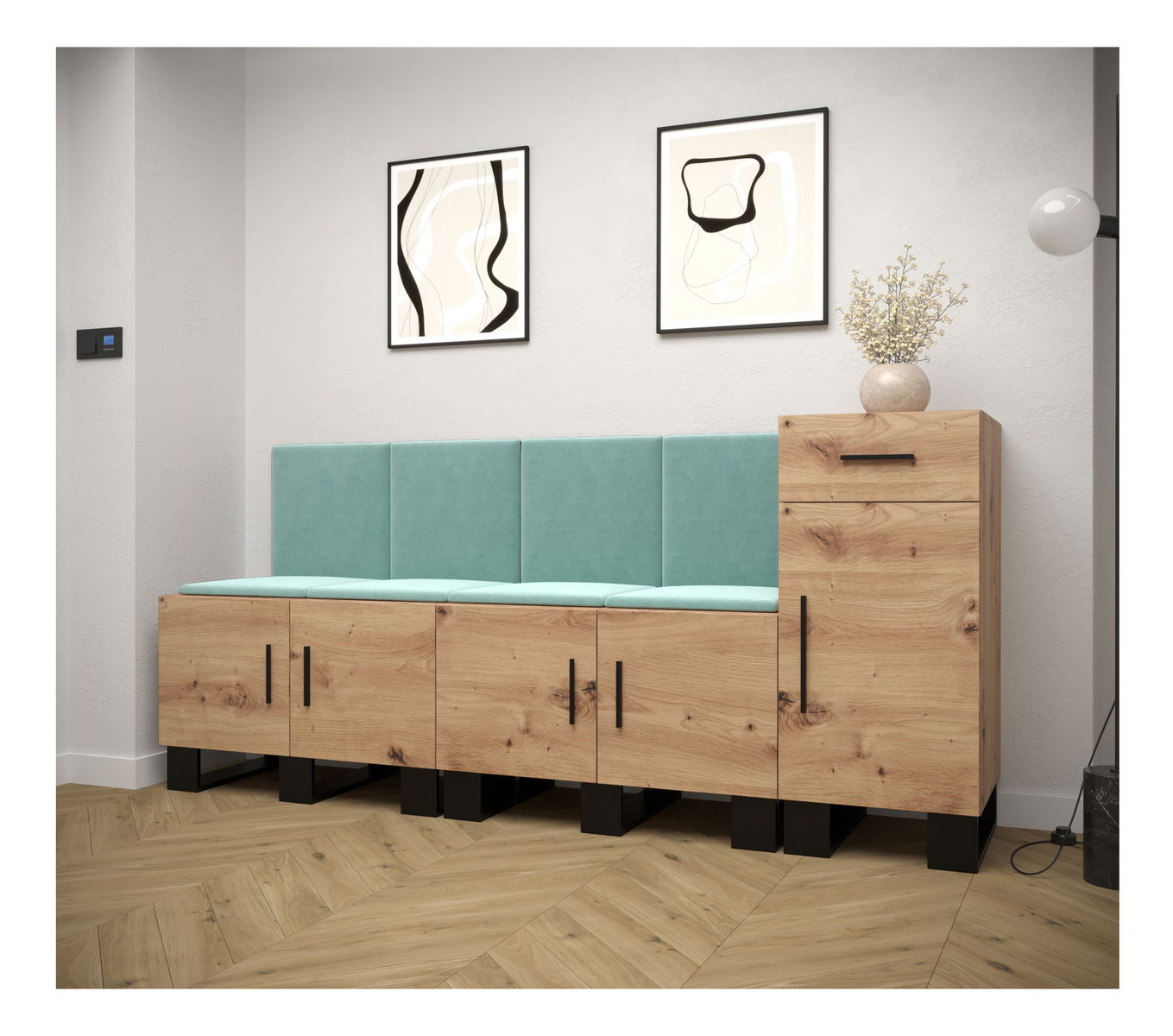 Designová předsíňová sestava Amanda se stane krásným a zejména praktickým doplňkem Vašeho interiéru. Dvojice skříněk na boty v kombinaci s komodou Vám nabídnou velký úložný prostor pro obuv a také Vaše osobní věci či drobnosti. Moderní akcent síně je zvýrazněn i čalouněnými panely, které předsíni dodávají nejen přitažlivý styl a eleganci, ale také poskytují i ochranu Vašeho nábytku před poškozením a výborné akustické vlastnosti.