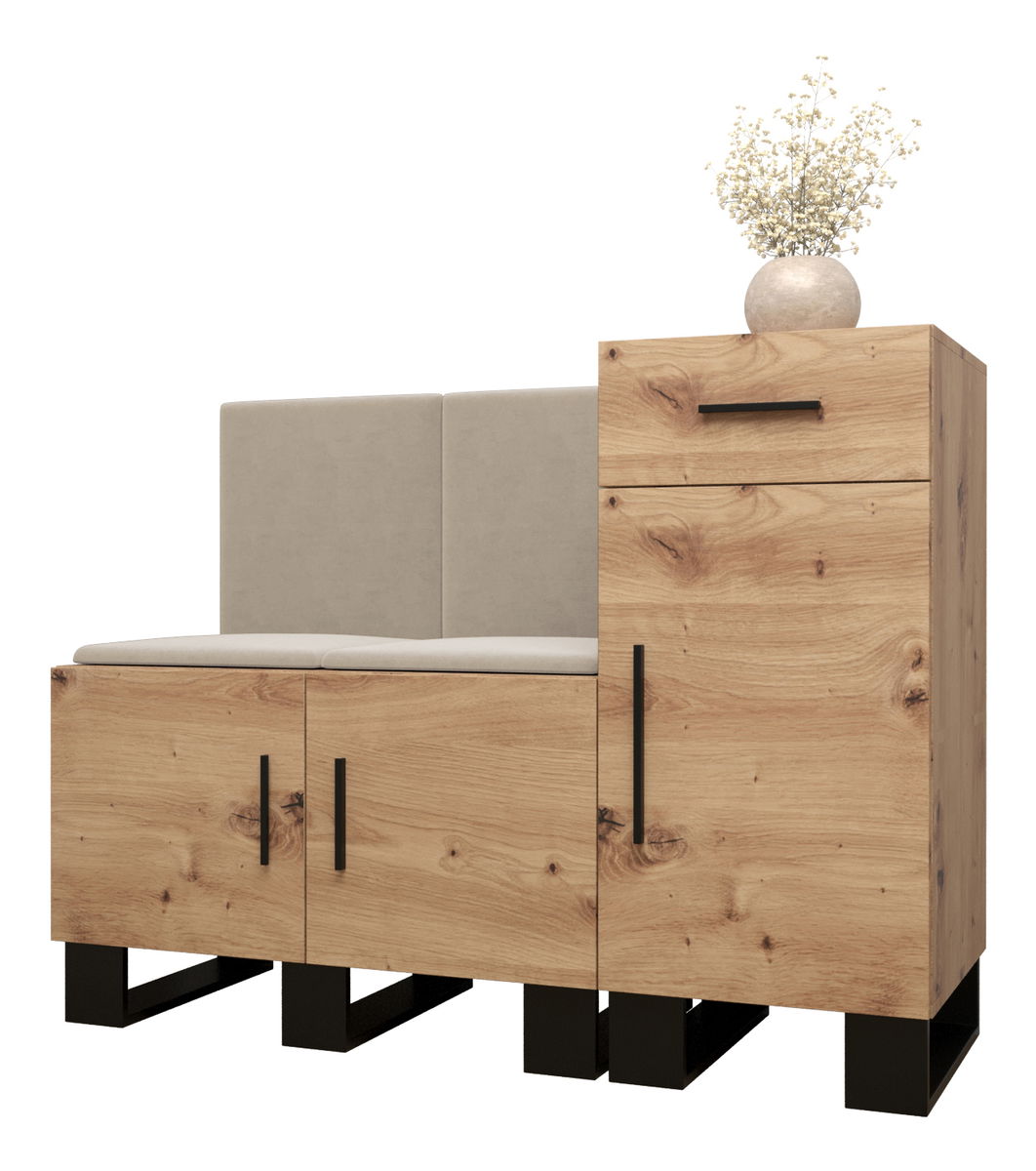 Designová předsíňová sestava Amanda se stane krásným a zejména praktickým doplňkem Vašeho interiéru. Kombinace skříňky na boty a komody Vám nabídne praktický úložný prostor pro obuv a také Vaše osobní věci či drobnosti. Moderní akcent síně je zvýrazněn i čalouněnými panely, které předsíni dodávají nejen přitažlivý styl a eleganci, ale také poskytují i ochranu Vašeho nábytku před poškozením a výborné akustické vlastnosti.