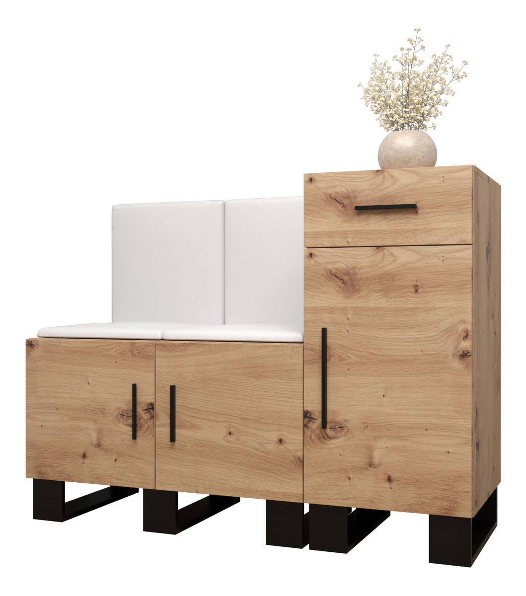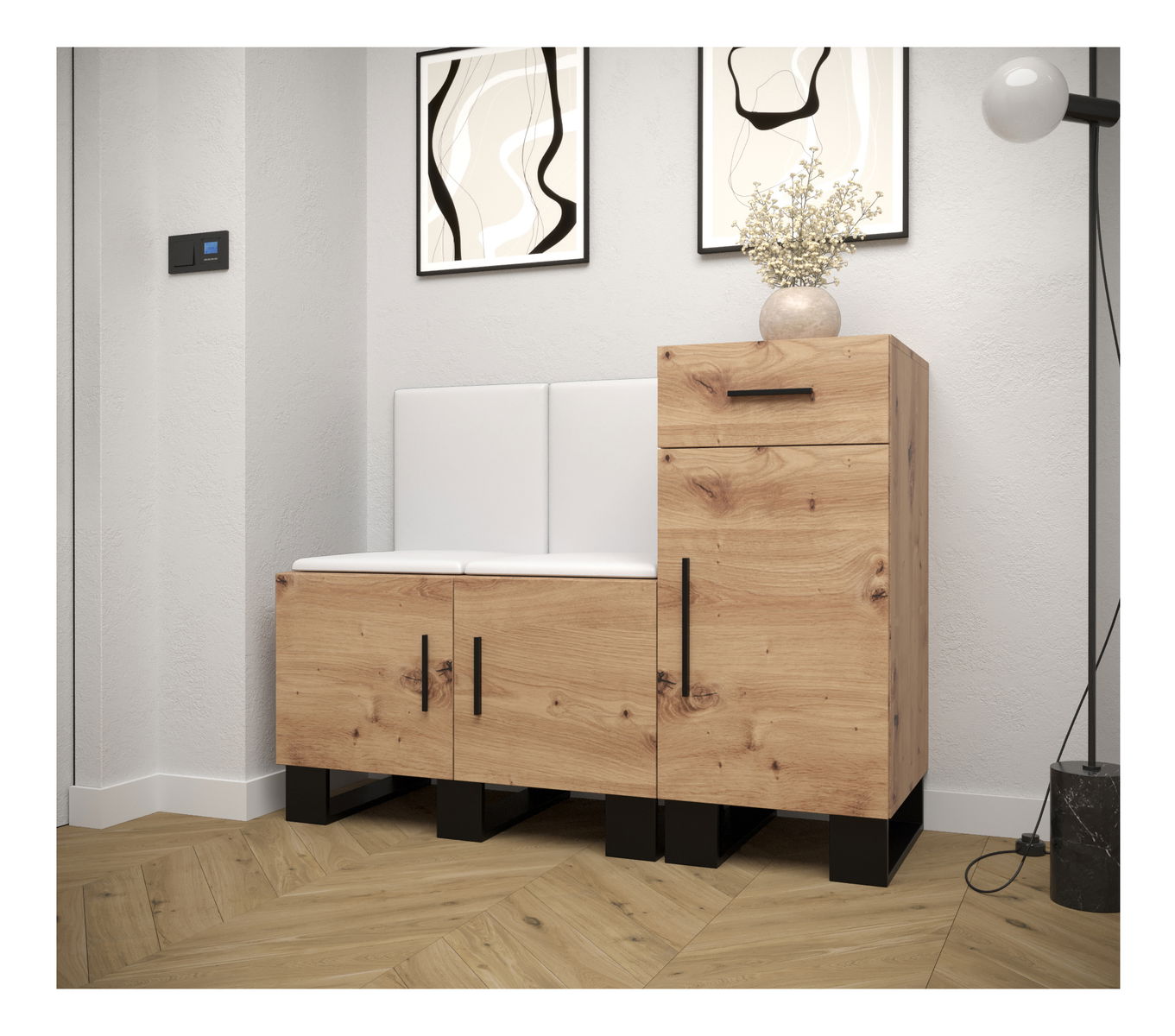 Designová předsíňová sestava Amanda se stane krásným a zejména praktickým doplňkem Vašeho interiéru. Kombinace skříňky na boty a komody Vám nabídne praktický úložný prostor pro obuv a také Vaše osobní věci či drobnosti. Moderní akcent síně je zvýrazněn i čalouněnými panely, které předsíni dodávají nejen přitažlivý styl a eleganci, ale také poskytují i ochranu Vašeho nábytku před poškozením a výborné akustické vlastnosti.