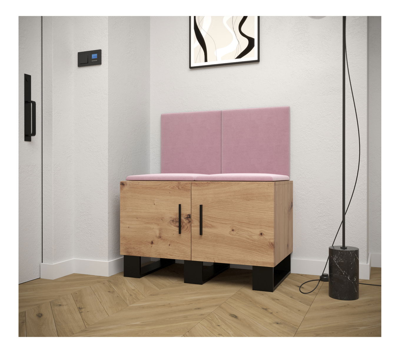 Designová předsíňová sestava Amanda se stane krásným a zejména praktickým doplňkem Vašeho interiéru. Skříňka na boty Vám nabídne prostor pro uložení Vaší obuvi s dávkou jednoduchosti a praktičnosti. Moderní akcent síně je zvýrazněn i čalouněnými panely, které předsíni dodávají nejen přitažlivý styl a eleganci, ale také poskytují i ochranu Vašeho nábytku před poškozením a výborné akustické vlastnosti.