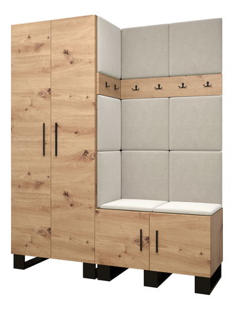 Designová předsíňová sestava Amanda se stane krásným a zejména praktickým doplňkem Vašeho interiéru. Praktická věšáková skříň v kombinaci s jedním čtyřvěšákem a jedním dvojvěšákem se s lehkostí postarají o uložení či zavěšení Vašich větrovek a kabátů a do malé skříňky se vejdou Vaše boty. Moderní akcent síně je zvýrazněn i čalouněnými panely, které předsíni dodávají nejen přitažlivý styl a eleganci, ale také poskytují i ochranu Vašeho nábytku před poškozením a výborné akustické vlastnosti.