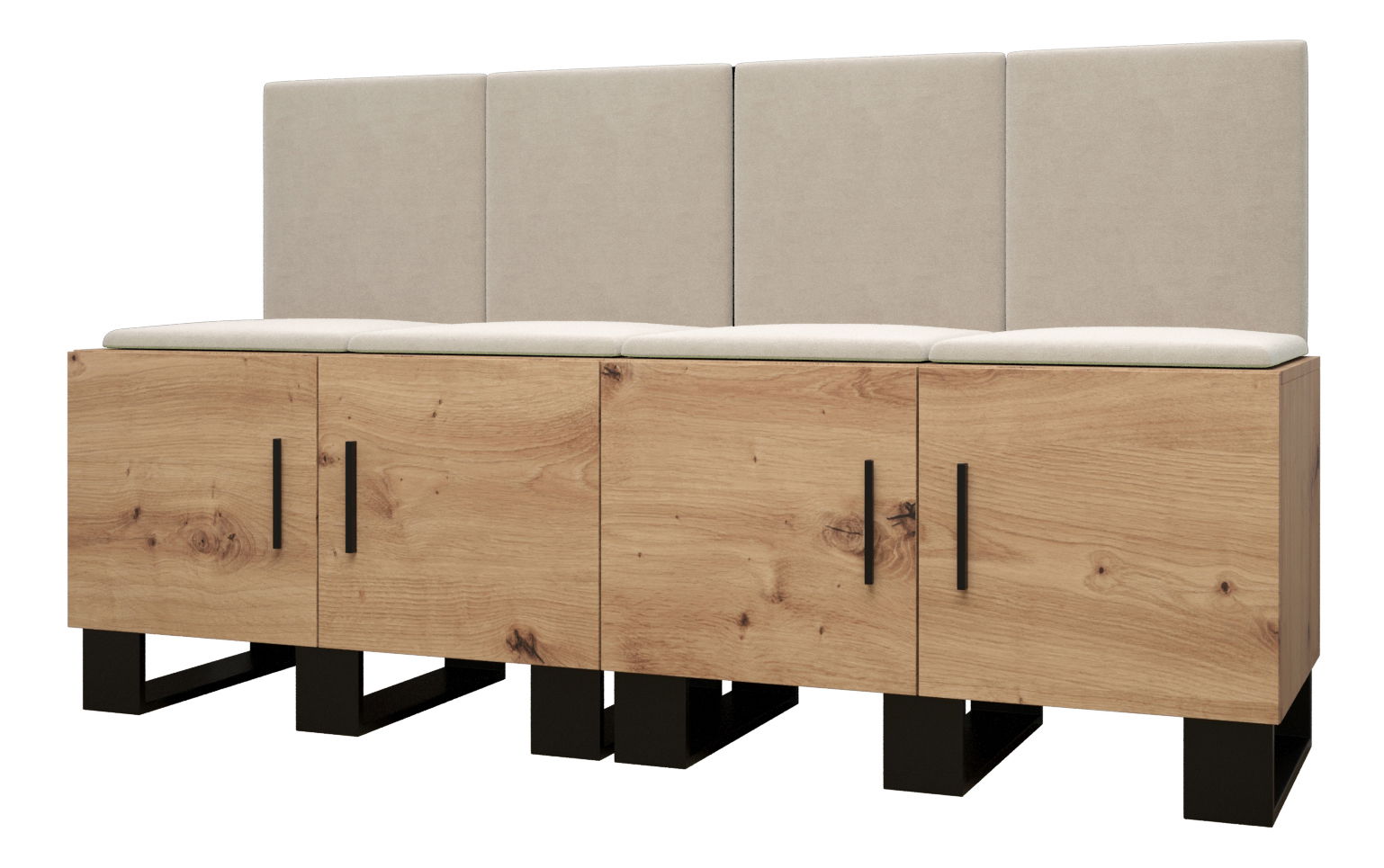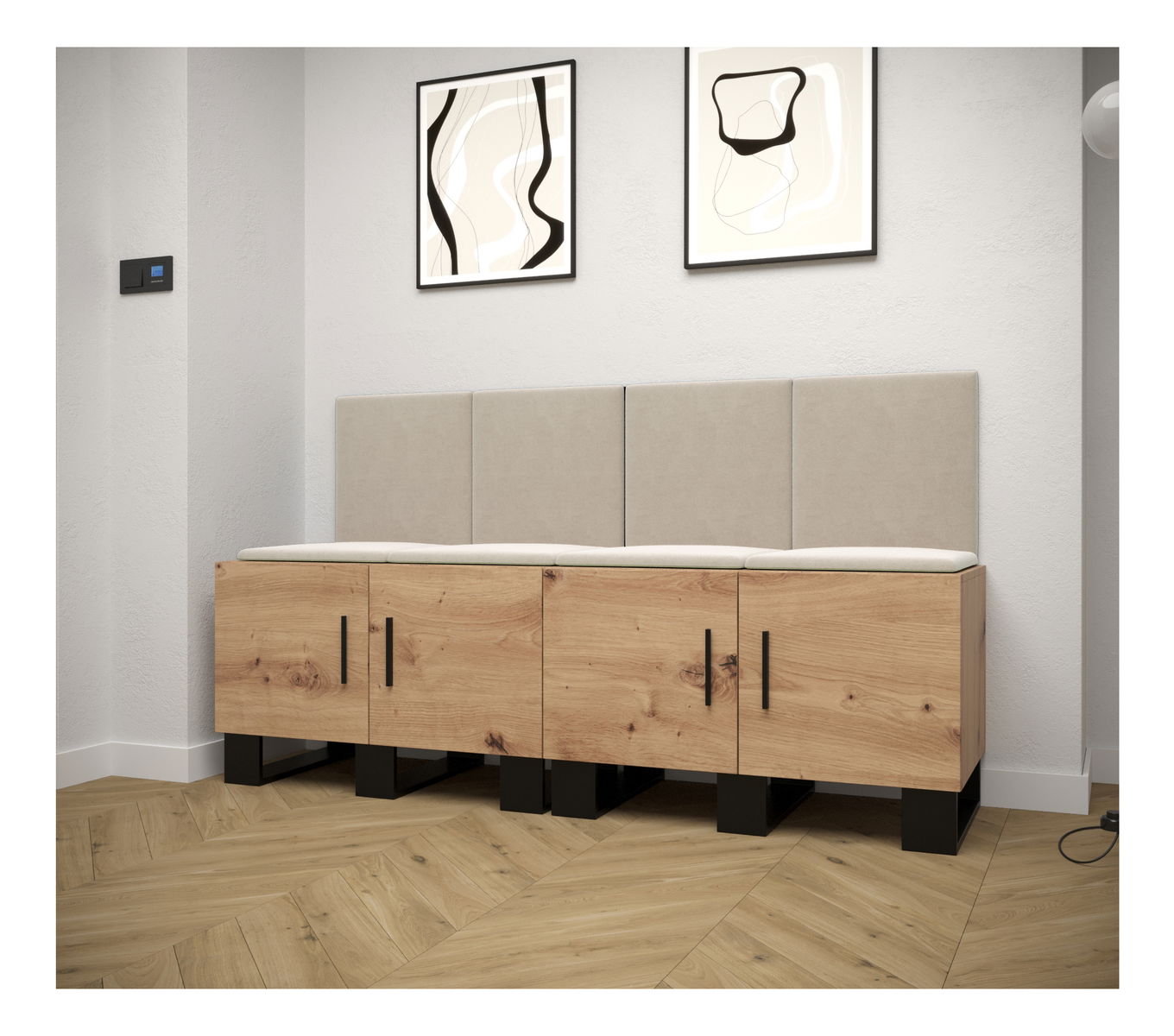 Designová předsíňová sestava Amanda se stane krásným a zejména praktickým doplňkem Vašeho interiéru. Dvojice skříněk na boty Vám nabídne více než dostatečný a zároveň praktický prostor pro uložení Vaší obuvi. Moderní akcent síně je zvýrazněn i čalouněnými panely, které předsíni dodávají nejen přitažlivý styl a eleganci, ale také poskytují i ochranu Vašeho nábytku před poškozením a výborné akustické vlastnosti.