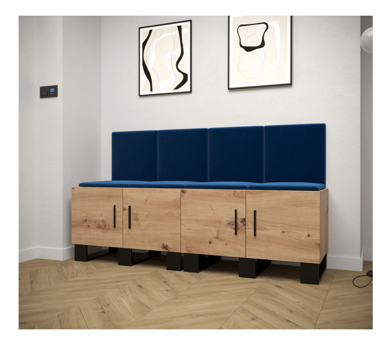Designová předsíňová sestava Amanda se stane krásným a zejména praktickým doplňkem Vašeho interiéru. Dvojice skříněk na boty Vám nabídne více než dostatečný a zároveň praktický prostor pro uložení Vaší obuvi. Moderní akcent síně je zvýrazněn i čalouněnými panely, které předsíni dodávají nejen přitažlivý styl a eleganci, ale také poskytují i ochranu Vašeho nábytku před poškozením a výborné akustické vlastnosti.