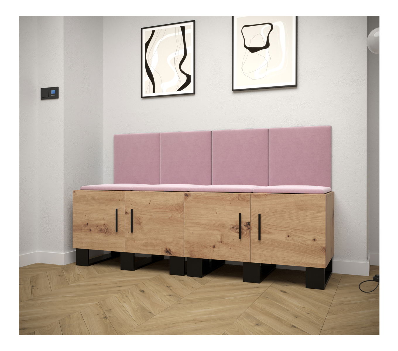 Designová předsíňová sestava Amanda se stane krásným a zejména praktickým doplňkem Vašeho interiéru. Dvojice skříněk na boty Vám nabídne více než dostatečný a zároveň praktický prostor pro uložení Vaší obuvi. Moderní akcent síně je zvýrazněn i čalouněnými panely, které předsíni dodávají nejen přitažlivý styl a eleganci, ale také poskytují i ochranu Vašeho nábytku před poškozením a výborné akustické vlastnosti.