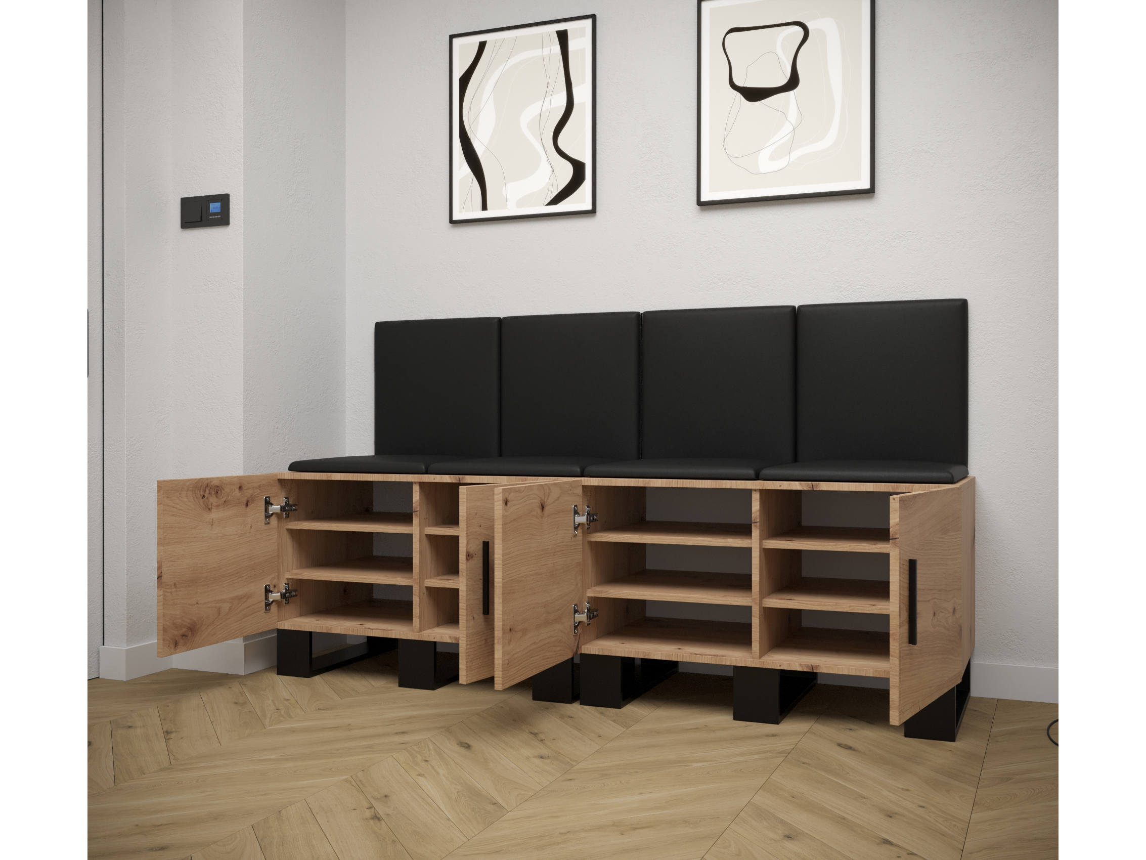 Designová předsíňová sestava Amanda se stane krásným a zejména praktickým doplňkem Vašeho interiéru. Dvojice skříněk na boty Vám nabídne více než dostatečný a zároveň praktický prostor pro uložení Vaší obuvi. Moderní akcent síně je zvýrazněn i čalouněnými panely, které předsíni dodávají nejen přitažlivý styl a eleganci, ale také poskytují i ochranu Vašeho nábytku před poškozením a výborné akustické vlastnosti.